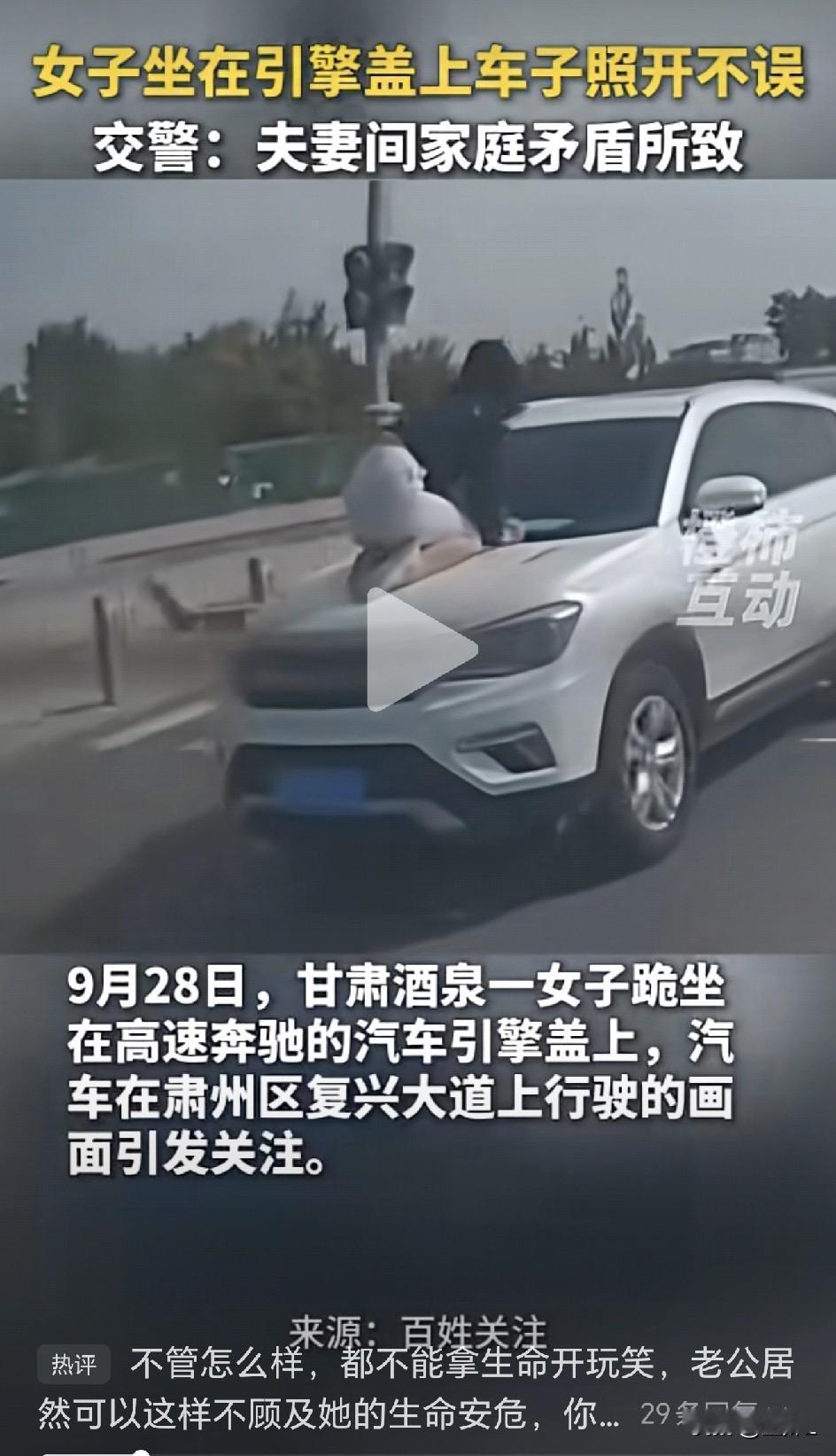 惊魂一幕!妻子引擎盖上跪坐疾呼,丈夫车内驾车未停……失控的夫妻关系,为何要让社会买单? 9月28日上午,甘肃酒泉市肃州区,一对夫妻因为家庭矛盾,闹到了马路上。 妻子跪坐在行驶中的汽车引擎盖上,捶打前挡风玻璃。而丈夫手握方向盘,脚踩油门。 车辆在疾驰,夫妻隔着汽车前挡风玻璃还在争论着什么。 路过的行人看到这危险的一幕,拍了下来,并紧急报警。 因为丈夫危险驾驶,交警对司机进行了驾驶证扣分和罚款的处罚。 警方认定他们为治安纠纷,强调涉事双方行为已危及公共安全。目前,警方已经介入调解双方矛盾。 有人说,这是蓄意谋杀,喊话妻子赶紧离开他。 也有人说,如此情绪化的妻子,早分早好。 真是不是一家人,一进一家门,一个敢爬一个敢开,针尖对麦芒,半斤八两啊! 什么样的夫妻矛盾,要玩成这样的速度与激情?还要全社会为你们的不负责行为买单? 有问题解决问题,有分歧协商分歧。这日子能过就过,活不下去就离。现在这个社会离婚又不是什么要人命的事,犯得着为了矛盾搭上自己的性命吗? 就算你们不想要命了,何曾想过你们的父母、子女和无辜的路人? 这样的危险行为真是要不得,社会没有责任为你们的任性行为买单。 虽然不知道他们的具体矛盾是什么,无外乎钱和情。 如果有人背叛了家庭,分割财产离婚就好。 如果有人为了工作忽略了家人,明明白白说出来自己的委屈和期待,让对方明白,家人和工作一样重要。要是改变不了对方,不想离就改变自己。 如果因为对方的原生家庭,不要指手画脚,孝顺自己的父母天经地义,谁也无权指责谁。 婚姻,说白了就是一场求同存异的合作。 从来没有谁可以在婚姻里说一不二,一时的风头正盛,埋下的全是隐患的种子。 在这场长达几十年的合作中,尊重永远是最有效的解药。 面对违约,无非两条路。要么继续一直走下去,那就只能选择妥协。要么分道扬镳,从此路归路桥归桥,各自安好。 无论什么样的选择,都不应该是这样过激的行为,把矛盾的严重后果,让路人承担。 这一次,万幸没有出事,下一次呢?谁能保证下一次还会这么幸运? 过日子不是玩过家家,翻脸了可以打翻所有道具重来。 婚姻里打碎了的裂缝,无论用什么样高档的粘合剂,缝隙永远都会存在。 而破镜重圆,终究不过是有人包容了一切委屈而已。 信息来源于都市快报,侵联删!
