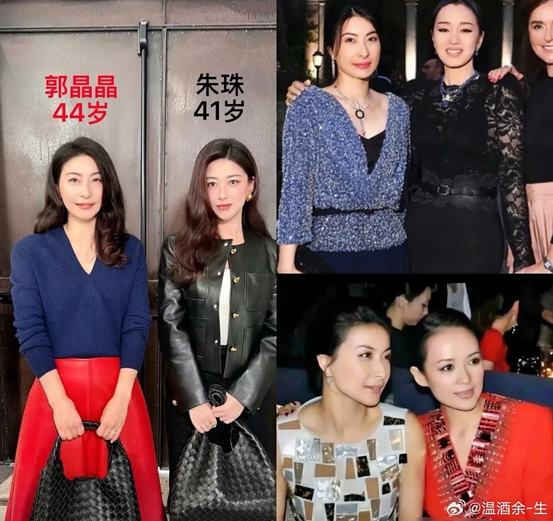 照片中,郭晶晶蓝色的V领针织衫,搭配红色皮质长裙,朱珠一身黑色皮衣搭配高开衩半身裙,是两人都是大波浪卷发,却美的各有千秋,谁也没压谁的风头。