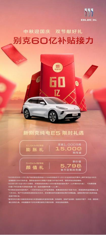 十月购车季来临,各大品牌纷纷推出促销政策。别克品牌豪掷60亿超级红包启动"补贴接力"活动,以真金白银的福利覆盖多款车型。购买昂科威 Plus、昂科威 S、君越(指定车型)、君威、GL8 陆尚、威朗、微蓝 6 等热门车型,限时享"1000 元抵 5000 元"购车膨胀金;同时,购买别克纯电 E5 先享版,限时至高享"1000 元抵 15000 元"超级膨胀金;购买别克纯电 E5 智享版,限时免费获赠一款限量版炫色车衣。此外,购车更可享受至高 25000 元置换补贴。26款昂科威Plus秉承"多10%"造车理念,在性能操控、舒适空间、智能体验及安全品质四大维度实现越级表现,新增"寰宇紫"专属内饰配色,标配前排吸风式座椅通风和行车记录仪等实用配置,真正实现"标配即满配"的用车体验。君越作为豪华舒享座驾,已赢得超过130万用户信赖,26款君越全系搭载别克V5.0车机系统,新增丹霞墨韵双拼内饰配色,更将方向盘加热、前排座椅按摩、副驾老板键等豪华配置纳入全系标配,以"入门即豪华"的诚意打造越级驾乘体验。活动刚刚开始,便引起了广泛关注,感觉兴趣的朋友可通过官方渠道了解更多活动详情。别克这次来真的狂撒60亿红包补贴 别克E5零自燃