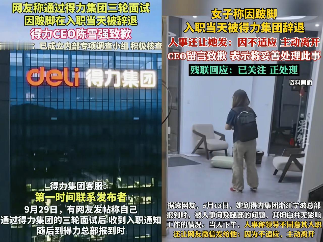 果然事教人,一教就会, 得力集团道歉了, 但他们并不是知道自己错了,只是怕自己的饭碗不保。 三轮面试都过了,就因为走路跛脚,入职当天就被劝退,还逼人家发“自愿离开”的消息,这操作哪是大企业能干出来的活儿? 等舆情烧到眼前,CEO道歉、总裁办主任飞过去面谈的戏码全上了,又是问责又是改流程,看着诚意满满。 可当事人一句“不回去了”,直接戳破了这场公关秀——心伤透了,再补救也没用。 得力用辞退否定别人的努力,用道歉敷衍公众,诚意?早被套路冲得七零八落了。 一家公司,要是连有缺陷的员工都容不下,还谈什么“尊重”? 你还会继续买得力的办公用品吗? 残疾