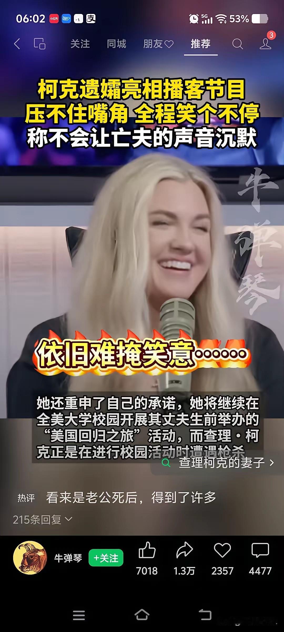 柯克的遗孀在接受电视访谈节目时表示:不会让丈夫的声音沉默,虽然他不幸遇害。 但全程看不到柯克遗孀,有那种刚刚丧夫之痛的感觉,全程嘴角上扬,欢笑写满了脸庞。仿佛是在上一档欢快节目,反而让主持人,也是不得不尴尬陪笑。 难道这就是人们常说的那句话:死了谁,苦了谁!或者他们倆,原本就并不幸福?这下好了,柯克遗孀可以彻底的放飞自我了。