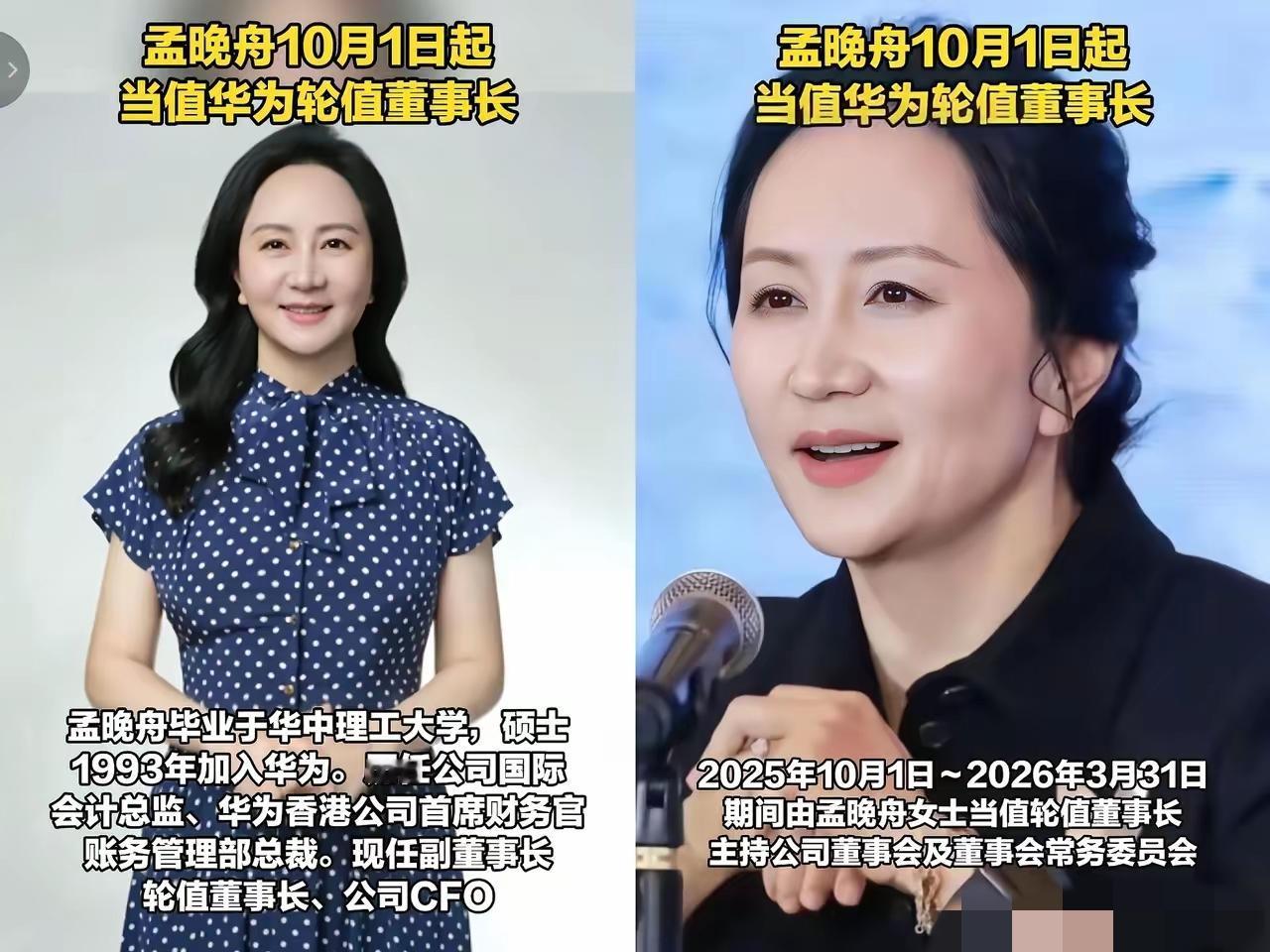 快讯!快讯! 华为事情突发! 华为正式宣布任正非女儿孟晚舟担任 董事长重任,2025年10月1日起接替徐直军当值半年! 别再拿“任正非女儿”说事儿了,她在华为30年干的全是硬活。 孟晚舟 1993 年就加入了华为,多年来成绩斐然。 从搞出全球统一的财经架构,到推IFS变革把精细化管理刻进华为基因,再到用“数出一孔”让数据变成战略资产,每步都踩在刀刃上。 三十年前那个青涩的姑娘从接电话做起。华为总机前的身影用甜美嗓音连接整个世界,这段基层经历成为她职场生涯的坚实起点。每个清晨她总是第一个来到办公室擦拭电话。 国际财经领域掀起变革风暴。孟晚舟主导搭建的全球统一财经架构覆盖一百七十多个国家,让千亿资金流动变得清晰透明。这套系统成为华为征战全球的坚强后盾,支撑着五万多个项目的顺利运转。 IFS变革在华为内部引发深刻革命。她引入的集成财务服务将精细化管理注入企业血脉,这项改革让华为运营效率提升百分之四十。财务报表的每个数字都在述说管理智慧。 “数出一孔”战略让数据成为企业宝藏。孟晚舟打造的财务数字神经系统覆盖全球十八万员工,每年处理超过千万笔交易。这些流动的数字河流汇聚成决策的智慧海洋。 加拿大那段艰难岁月见证她的坚韧。一千多个日夜的软禁没有磨灭她的意志,她始终保持着优雅与从容。那段经历如同淬火,让她的领导力更加闪耀夺目光芒。 华为董事会的灯光常常亮到深夜。孟晚舟与同事们讨论着公司未来发展方向,她的见解总是切中要害。这份沉稳来自三十年如一日的坚守与付出。 任正非办公室的窗户映出深圳的夜空。这位老父亲看着女儿一步步成长,眼角泛起欣慰的泪光。他深知这个任命是对女儿能力的最佳认可,更是华为薪火相传的象征。 全球通信产业正面临深刻变革。华为在5G领域取得突破性进展,市场份额稳居世界前列。这些成就背后有着财务管理团队的默默支撑与保障。 孟晚舟的办公室挂着一幅中国水墨画。画中竹子挺拔向上,正如她在职场中的成长轨迹。从普通员工到集团董事长,这条路她走了整整三十二年。 华为园区里的荔枝树又到了结果季节。这些果树见证着无数像孟晚舟这样的奋斗者,他们用青春浇灌着中国科技的梦想。每一颗甜美果实都饱含着辛勤汗水。 国际媒体聚焦这场权力交接。《金融时报》用整版报道这位东方女性企业家,她的故事正在激励无数职场女性。专业能力永远是最动人的魅力源泉。 东京证券交易所的屏幕上跳动着华为概念股。投资者们用真金白银表达对这次人事变动的认可,股价单日上涨百分之三点五。市场永远是最诚实的投票器。 华为财务部的年轻员工们倍感振奋。他们看到职业发展的新希望,公司内部涌现出更多学习热潮。这种示范效应正在激发组织活力。 硅谷的科技巨头们重新评估这位东方女性。孟晚舟的国际视野与专业素养令人印象深刻,她的任职将推动华为全球化进入新阶段。世界需要这样的商业领袖。 黄昏时分孟晚舟喜欢在华为园区散步。她时常驻足在研发大楼前,那里亮着的灯火让她感到温暖。这些光芒承载着中国科技的未来与希望。 麻烦看官老爷们右上角点击一下“关注”,既方便您进行讨论和分享,又能给您带来不一样的参与感,感谢您的支持! 华为领袖 华为老总 任正非家风 华为二公主 华为轮值董事 华为公主 华为知情同意书 各位读者你们怎么看?欢迎在评论区讨论。