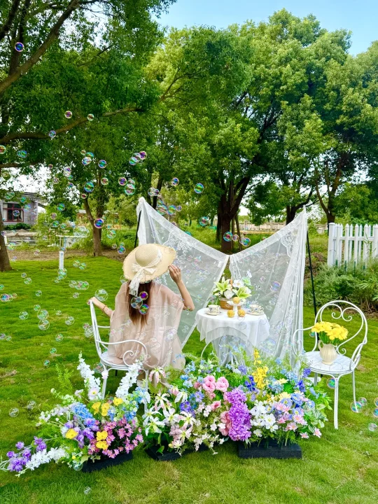 🌳草坪、鲜花、白纱布景,泡泡漫天飞,穿条小裙子来拍,分分钟出法式田园大片~