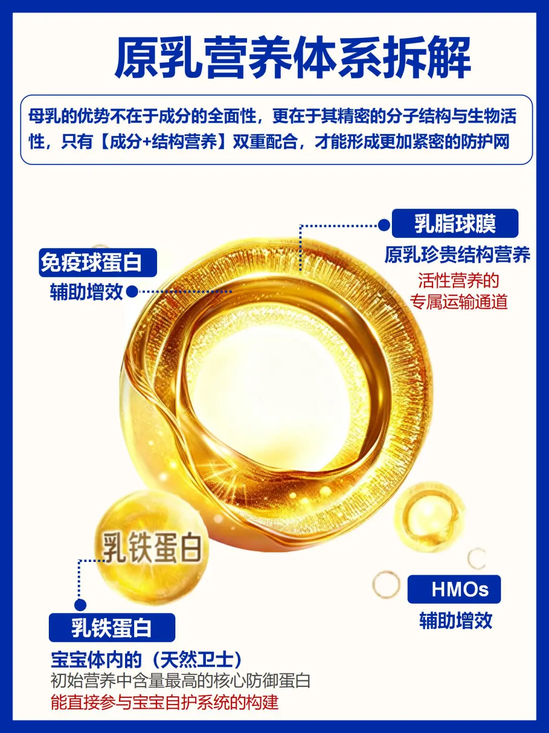 原乳是个精密的“营养系统”:就像积木得环环相扣才稳固,原乳里的活性自护营养,都得附着在特定结构上发挥作用。其中的关键结构营养就是乳脂球膜——它是原乳自带的“天然营养载体”,含90%原乳同源的蛋白群,裹着700+活性营养,能把核心营养精准送到宝宝👧🏻肚子里,不浪费、好吸收