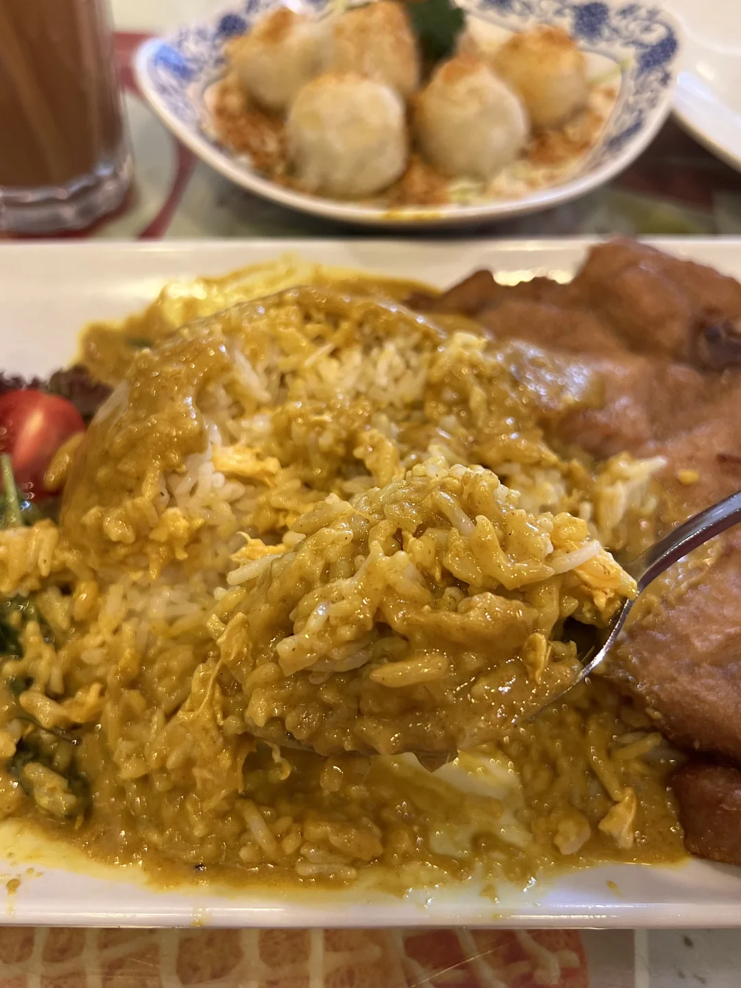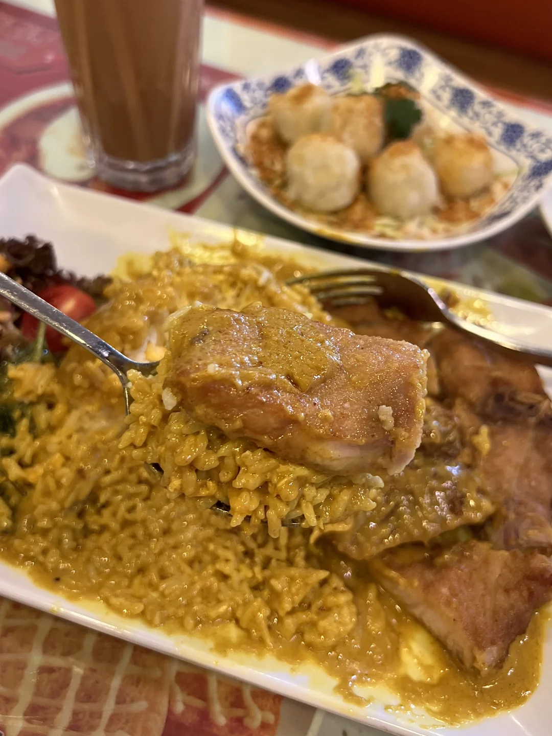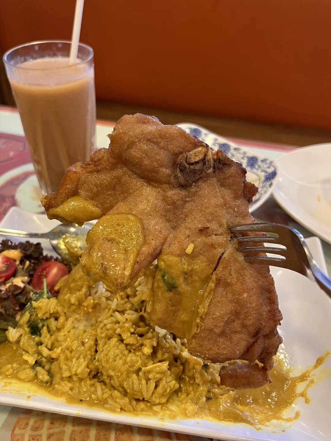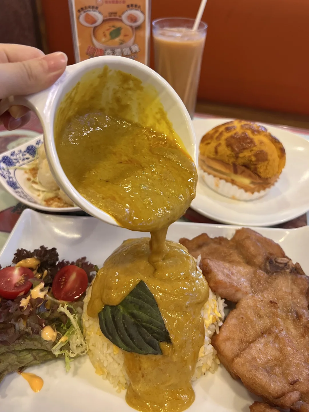 咖喱味道非常正宗!椰香浓郁带一点辛辣,选了炒饭底,跟咖喱拌在一起吃尊的香迷糊了🤤厚切猪扒比我的手还大😍