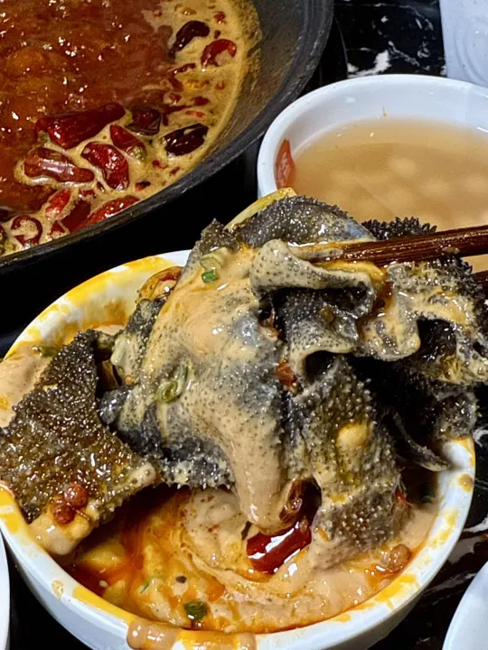 我们点的重庆全红锅底,浓香醇厚,辣而不燥,涮啥都好吃到爆!粉嫩虾肉裹着晶莹鱼籽,虾肉Q弹鲜甜,鱼籽噗嗤噗嗤在嘴里爆开,鲜辣清甜~