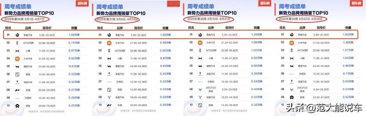 月交付破6万,下线破百万,零跑今年“杀疯了”! 最近零跑汽车的好消息真的是一个接一个。先是在9月底官宣了品牌第100万台整车下线,至此零跑成为第二家实现百万下线的新势力。然后就是近日,零跑公布了9月交付量:66657台,凭借这一成绩,零跑成为了新势力中第一家单月交付破6万的品牌,蔚小理、小米、问界等品牌只能作为看客,围观零跑刷新新势力交付历史记录。 可能有人会说,零跑会不会是昙花一现?我想不会,这是因为零跑不仅车型多,而且每一款都定位精准,直击用户的用车刚需,而且零跑坚持以成本定价,提倡科技平权和技术平权,为大家带来好而不贵的产品,用诚意打动用户。我们看看零跑C10这款车,拥有多个同级唯一的产品力。比如说14万级唯一800V+605km长续航、14万级唯一高通SA8295P智舱+激光雷达端到端辅助驾驶、同级唯一自研LMC一体化运动融合底盘。光是看看这些核心产品力,你就知道2026款零跑C10有多强了。 而有了零跑C10这样的产品,零跑汽车的销量自然可以保持。根据上周的数据显示,零跑汽车新增订单达到了1.1万台,还是领先其他新势力品牌。 另外,零跑C10如今已经从国内走向了海外,在全球市场颇受欢迎,如今全球累计交付量已经达到了16万台,就连足坛巨星大吉鲁都是他们的第16万台车主。而有了C10的全球热卖,零跑今年1-9月出口量也超过了3.6万台,同样也是新势力第一。所以看完这些销量数据,知道我为什么说零跑今年“杀疯了”吧?