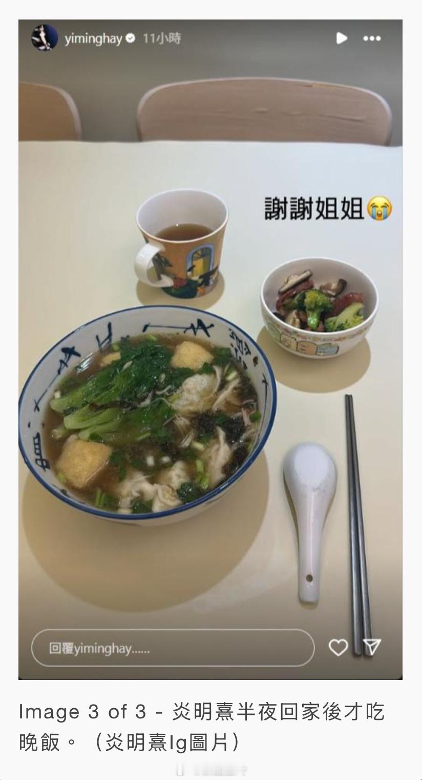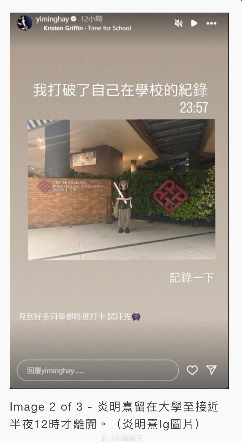 炎明熹回復自由身後參與音樂劇《一束光-高錕的記憶》,昨晚深夜近12時才離開大學,在校門前拍照「打卡」,記錄忙碌學業生活。(炎明熹Ig圖片 / 明報製圖)