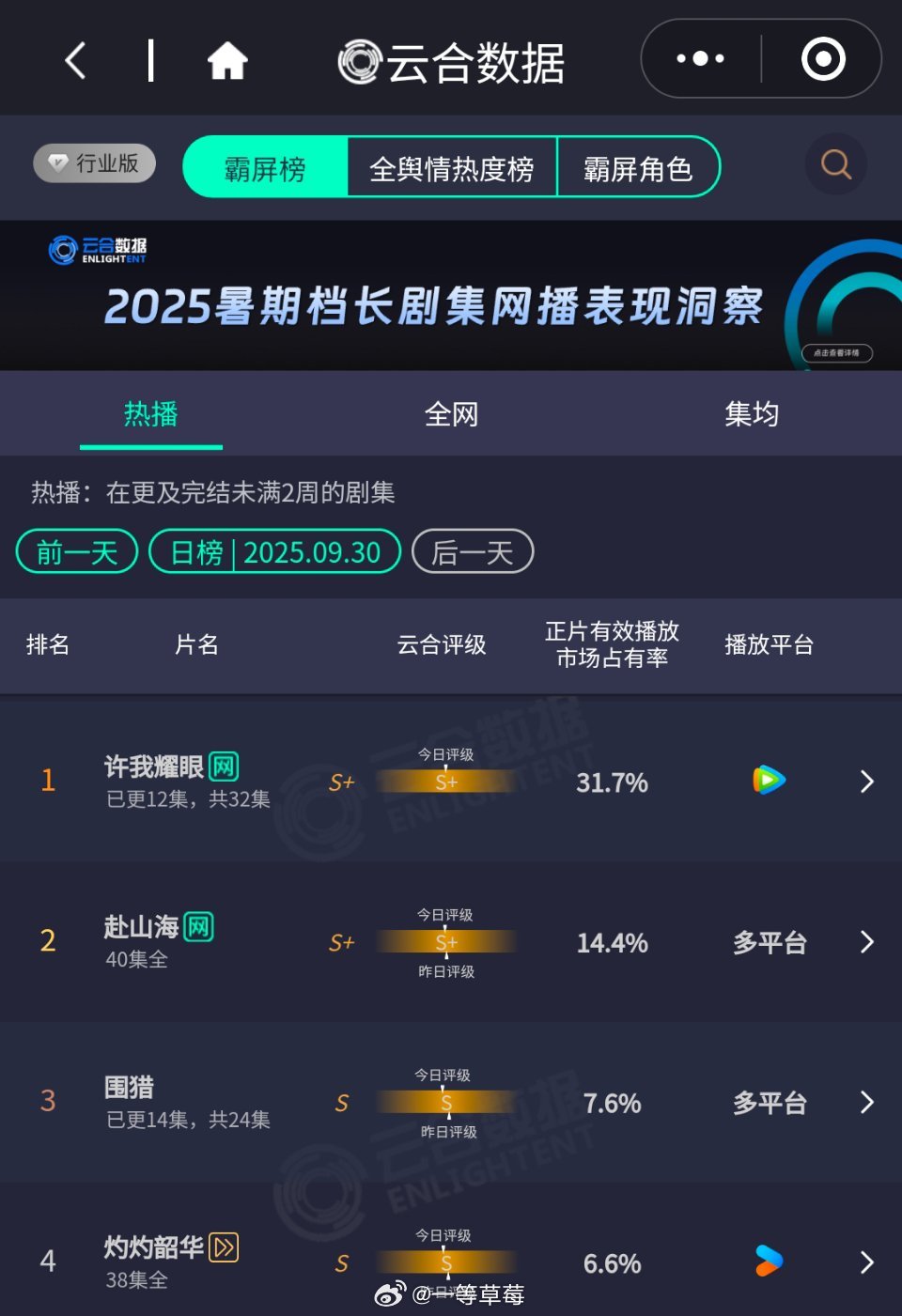 赵露思《许我耀眼》云合31.7%,评级S+,已断层登顶