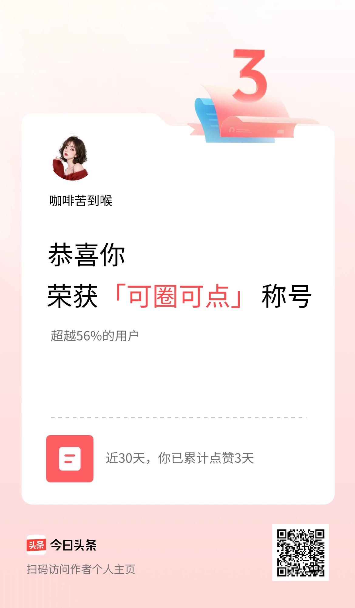 我在头条30天内点赞打卡3天,获得“可圈可点”称号