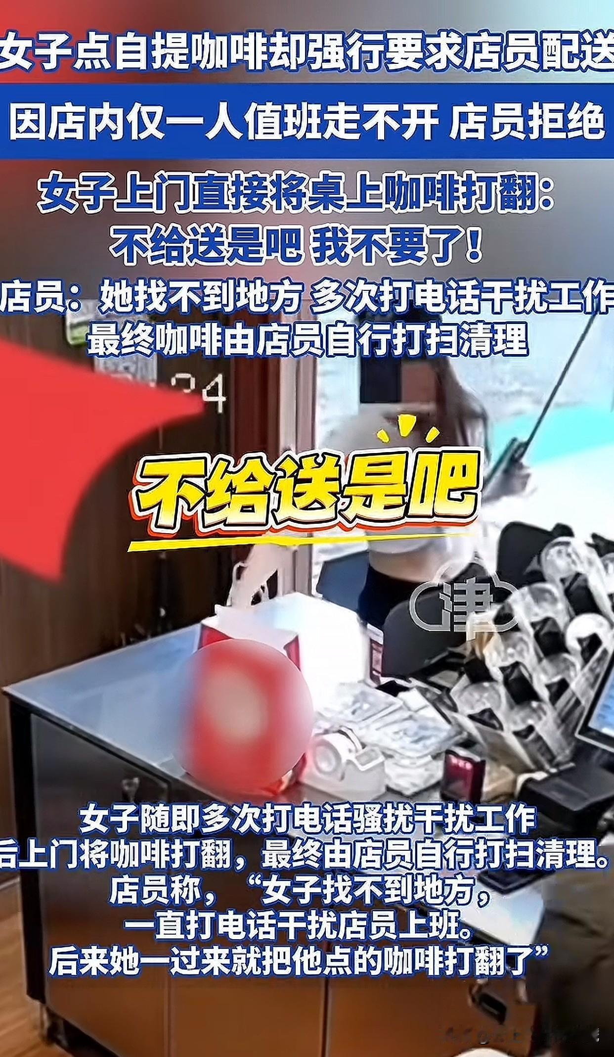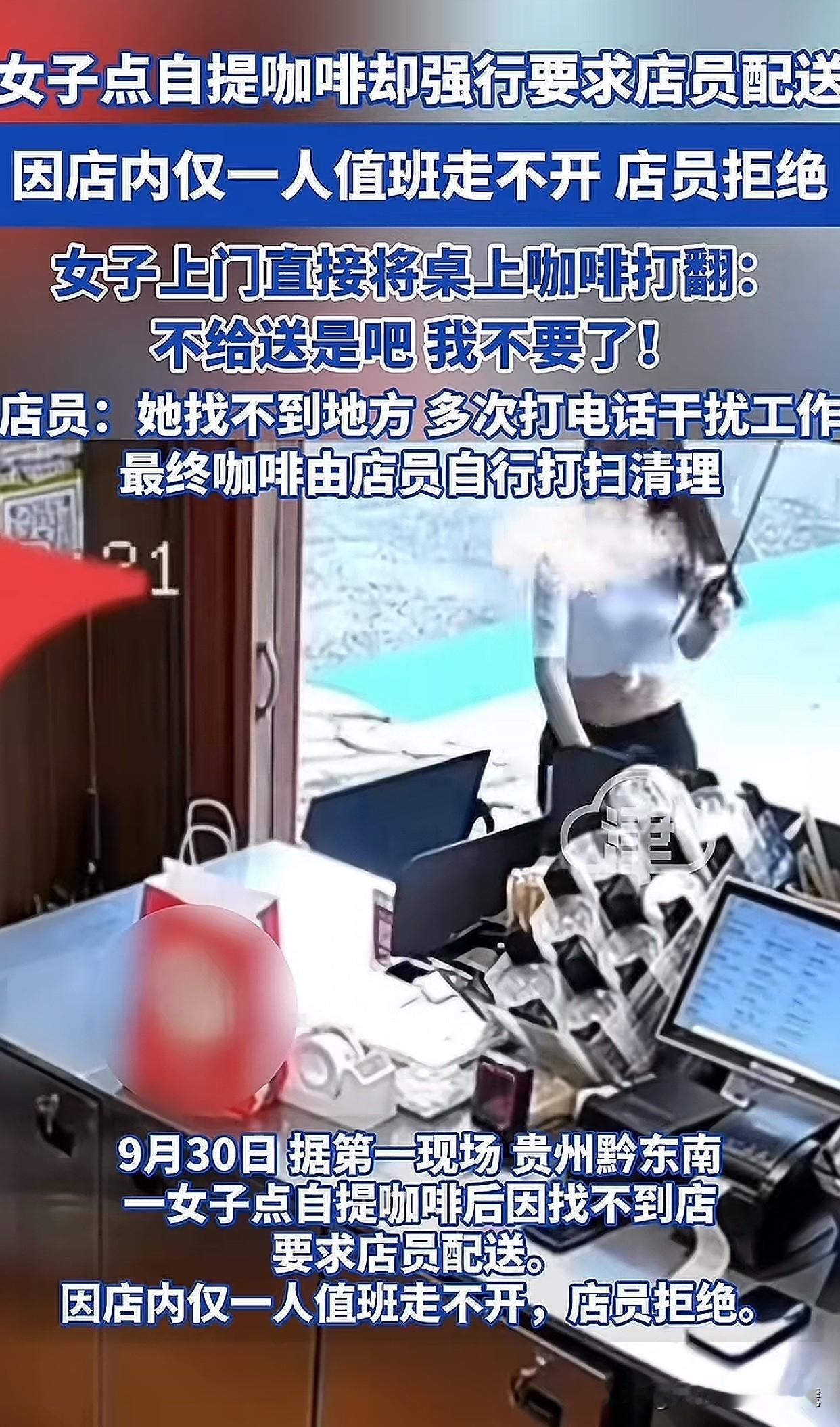 这下出名了 不仅贵州知道了,就连全国人民都知道了! 近日贵州一女子点了自提咖啡,不想跑一趟要求店员给送一下,还骗人说找不到地方,打了很多电话催促店员快些,因为店里就一个人值班走不开,店员就拒绝了。结果女子直接跑到店里,反手就把咖啡全泼了。这事被当地官媒一报,彻底凉凉,估计肠子都悔青了吧。 要我说,表面上是为省几块配送费,其实暴露了脾气比本事大。现在不少人,一不顺心就对服务员撒气,真说不过去。 说实话,谁都有情绪上头的时候,但成熟的人得学会踩刹车。等闹到全网皆知才后悔,不如一开始就好好说话。在公共场合给人留面子,也是给自己攒人品。 个人觉得,一个社会的文明程度,还真就看这种小事儿上大家怎么做人。