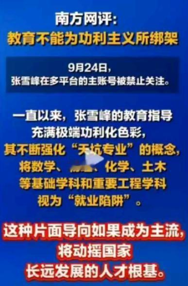 张雪峰的教育指导被定性了? 最近一则网评出来:教育不能为功利主义所绑架!从国家层面来说,各行各业都需要有人去从事,俗话说三百六十行,行行出状元,每一个行业做到好都有很不错的前景, 但现在大家似乎对专业专门定性成热门和冷门专业,还有所谓的“天坑专业”,如化学,土木,材料等等, 如果大家全都往一个热门专业去,人满为患同样竞争也大,也有可能过了多年后热门专业变成冷门专业,就像如今的土木一样, 关键从国家层面的角度来说,这样的片面导向对国家人才培养也是不利的,长远来看,很可能会动摇一些行业根基。