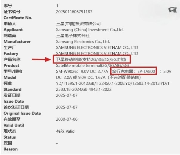 该机属于“心系天下”系列,面向商务场景,搭配 EP-TA800 电源适配器,最高支持 25W 充电,页面还标注不带适配器销售。此外页面信息还显示支持卫星通信,此外页面并未透露其它信息。