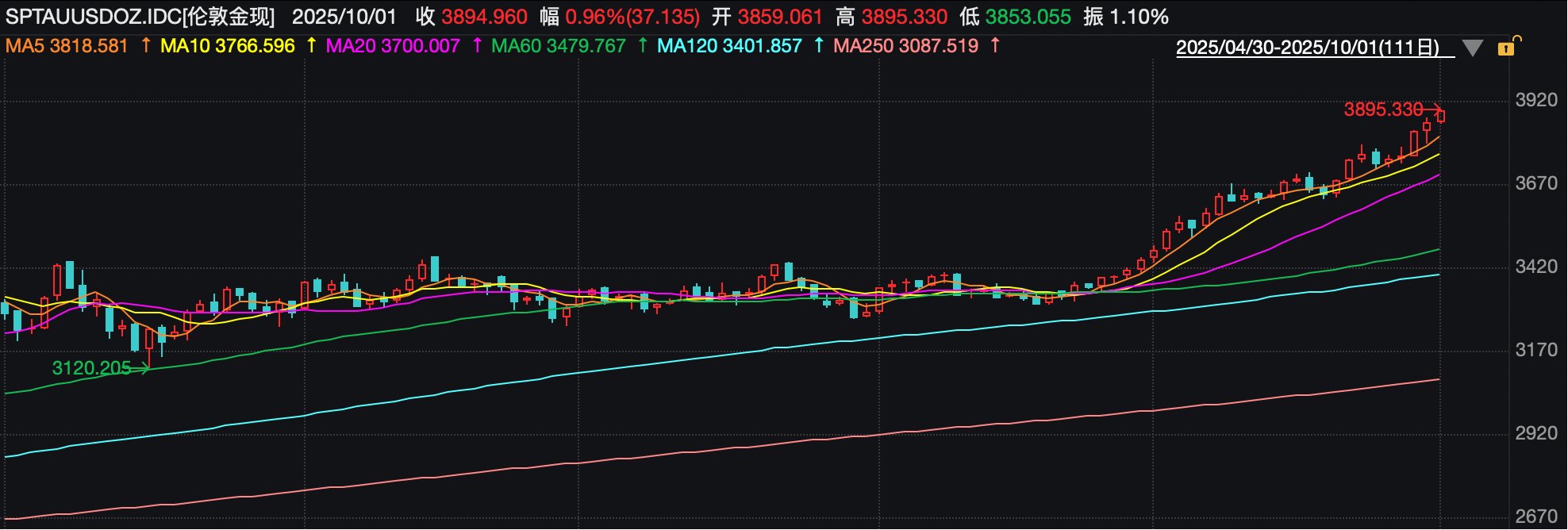 [新纪录!#金价见证历史##金价飙涨商家称不敢轻易增加库存#]#金饰克价涨至1130元#金价再创新高!10月1日,国际金价再度走高,伦敦金现盘中最高突破3895美元/盎司,再刷新历史纪录,距离3900美元/盎司关口仅一步之遥。COMEX黄金则突破3900美元/盎司,亦刷新历史纪录。10月1日,记者在黄金珠宝品牌周生生官网看到,其当日足金饰品报价已达到1130元/克,周大福的报价也达到1129元/克。