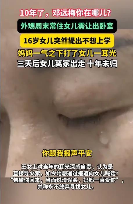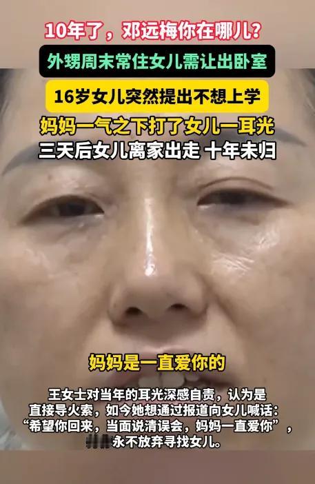十年了,王女士的微信头像还是女儿16岁的照片。她说总梦见女儿穿着校服回头看她,可一伸手,人就不见了。2015年那个耳光,不仅打红了女儿的脸,更像一根针,扎破了母女之间最后那点信任。 多少人曾以为这只是青春期叛逆,但没想到真的有那种决然的倔强!外甥来住,让女儿让出卧室。也许孩子要的从来不是一间卧室,而是被尊重的领地权。单亲妈妈为了亲戚委屈女儿,看似懂事教育,实则伤透了至亲的内心。青春期的尊严,很脆,也很贵。 父母总用为你好盖章,却忘了问孩子有没有感觉哪里不好。长期被忽视情感需求的孩子,一次打骂可能就是压垮骆驼的最后一根稻草。 爱不是控制,是拥抱和倾听。但愿所有父母都能懂。孩子的世界很小,小到一个房间就是全部。孩子的世界也很大,大到一次伤害,就是十年间渺无音训的江湖。