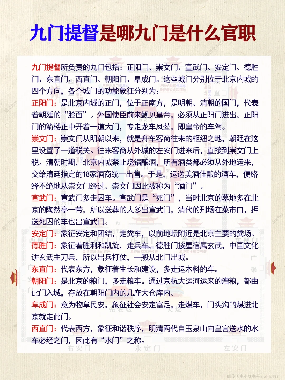 九门提督所负责的九门包括:正阳门、崇文门、宣武门、安定门、德胜门、东直门、西直门、朝阳门、阜成门,各城门功能象征分别为: