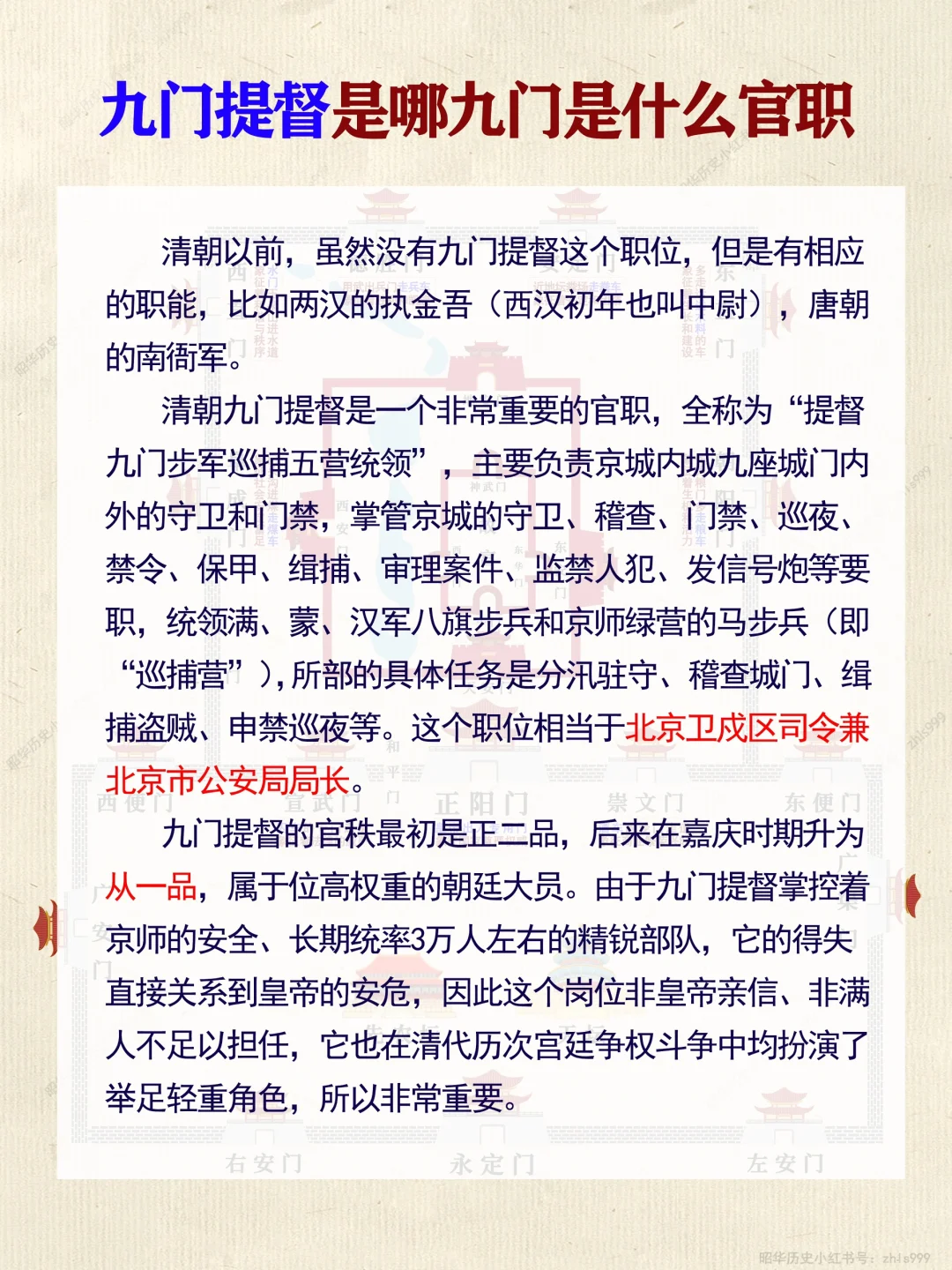 清朝九门提督全称为“提督九门步军巡捕五营统领”,主要负责京城内城九座城门内外的守卫和门禁,掌管京城的守卫、稽查、门禁、巡夜、禁令、保甲、缉捕、审理案件、监禁人犯、发信号炮等要职,统领满、蒙、汉军八旗步兵和京师绿营的马步兵(即“巡捕营”),所部的具体任务是分汛驻守、稽查城门、缉捕盗贼、申禁巡夜等。这个职位相当于北京卫戍区司令兼北京市公安局局长。