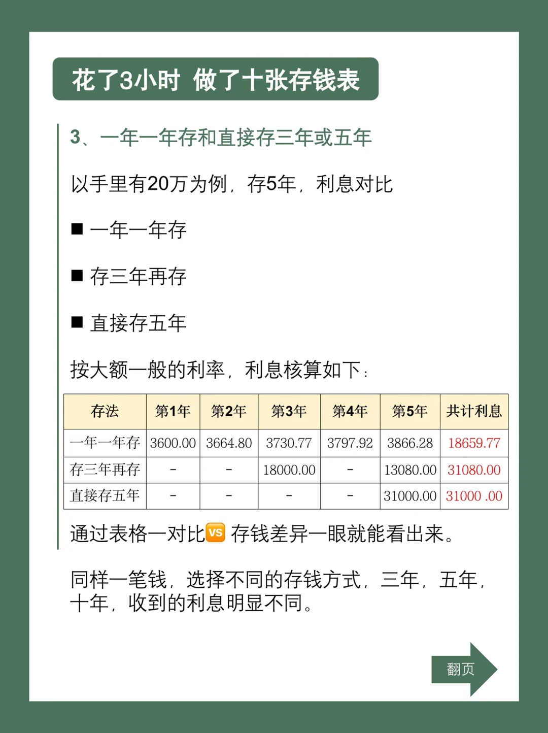 通过列表格的方式,把一年一年存、存三年再存三年、存五年再存五年,做利息对比。从图4表格可以直观清晰的看到,同样存五年,一年一年存,存三年再存三年,直接存五年,利息都不一样,三年期的要更优。