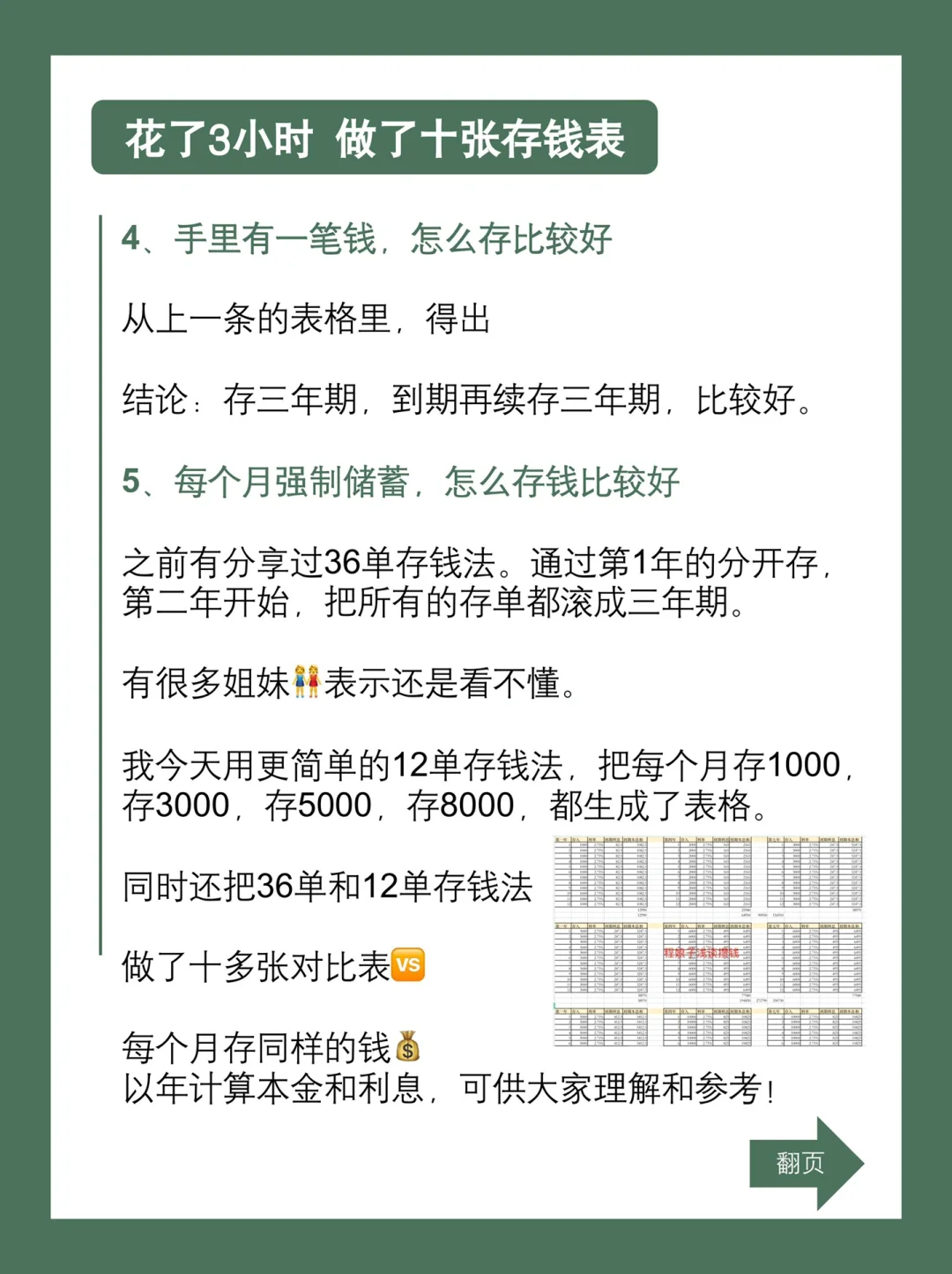 能看懂36单存钱法的姐妹,真的很建议照做,坚持,存500,存1000,存3000,存5000,存8000,都可以,根据自己的情况分配好金额就行。实在不会的,今天我把更简单的12单存钱法也做了一下,需要的也可以找我。对比36单存钱法,12单存钱法的第1个三年期,会比较煎熬,到第四年才会有第1笔三年期存款到期,轮动起来后,会好很多,也是每个月都有一笔三年期到期存款,可以和新存的钱,一起存三年期。