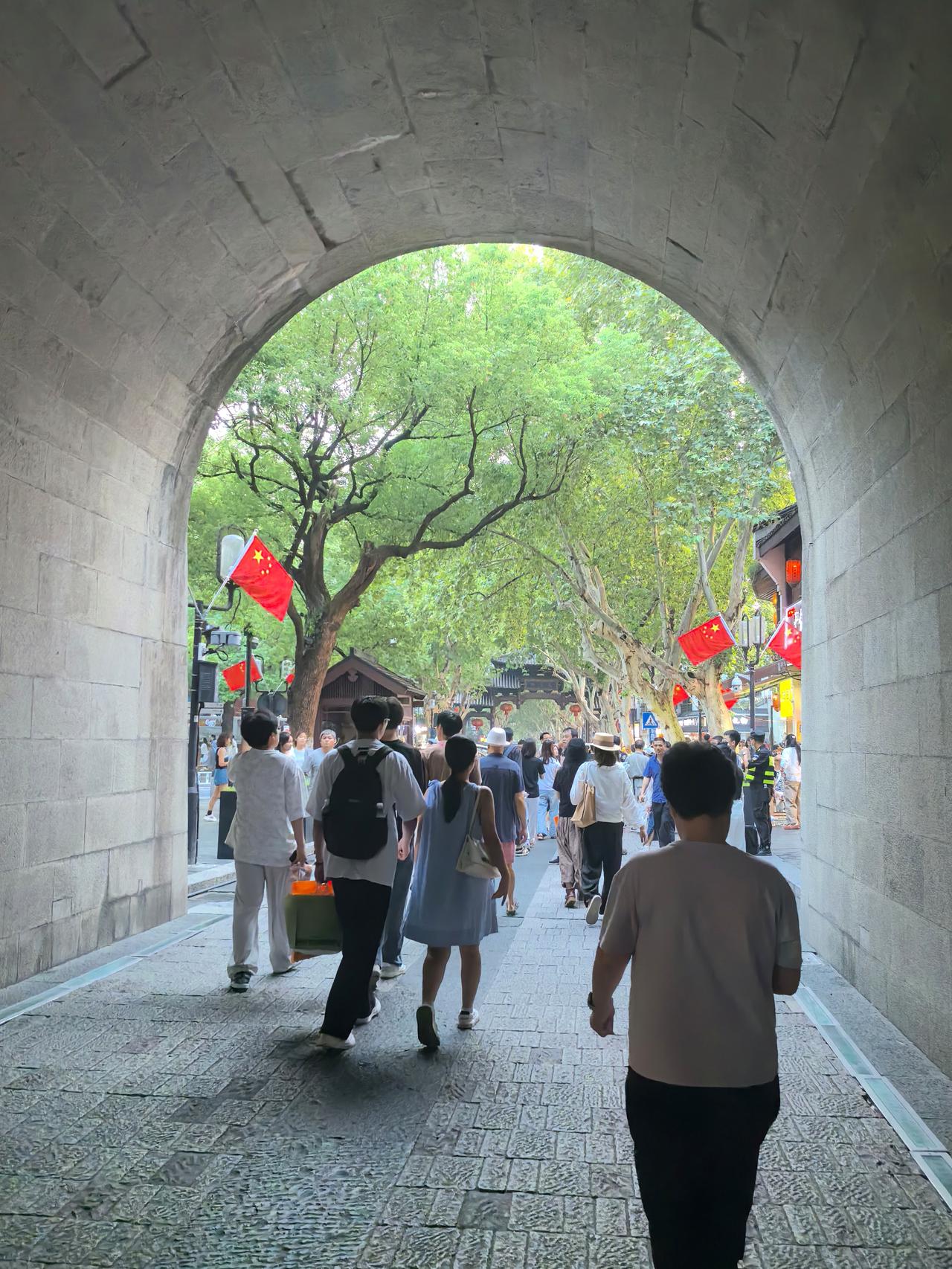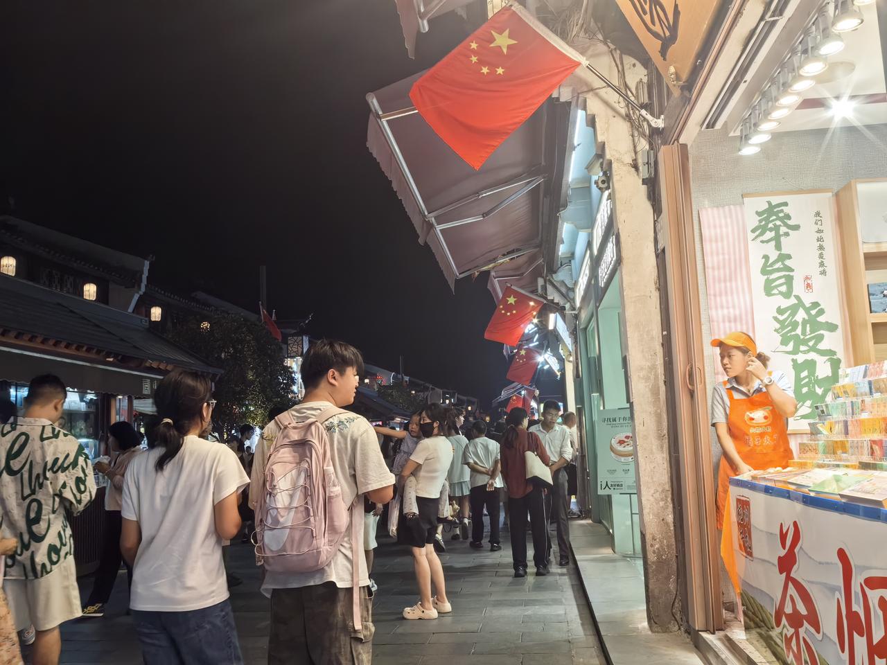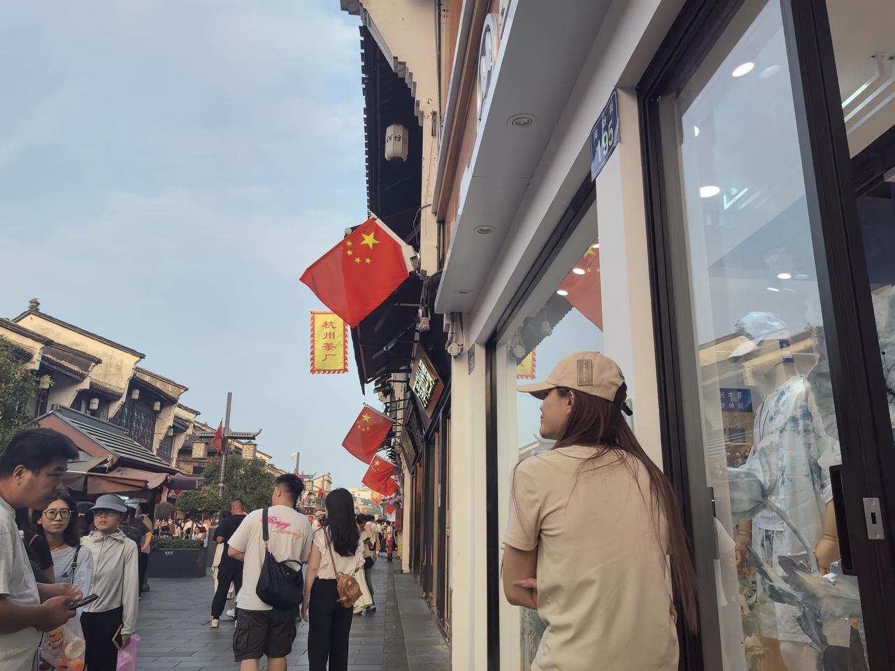 七律·河坊街国庆所见 粉墙黛瓦国旗红, 还活千年宋韵风。 酒旆铺前迎远客, 檐头