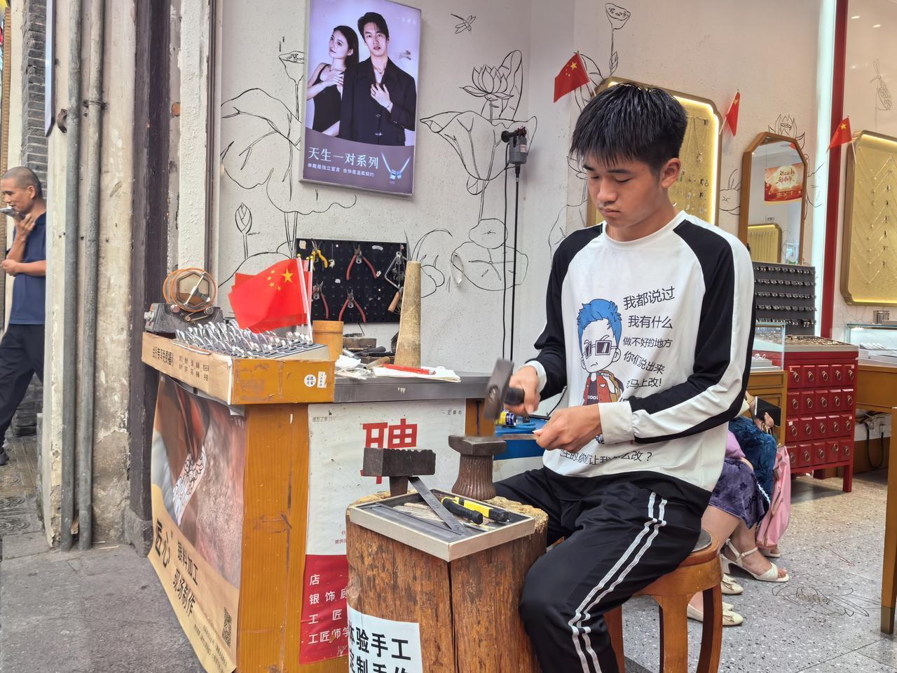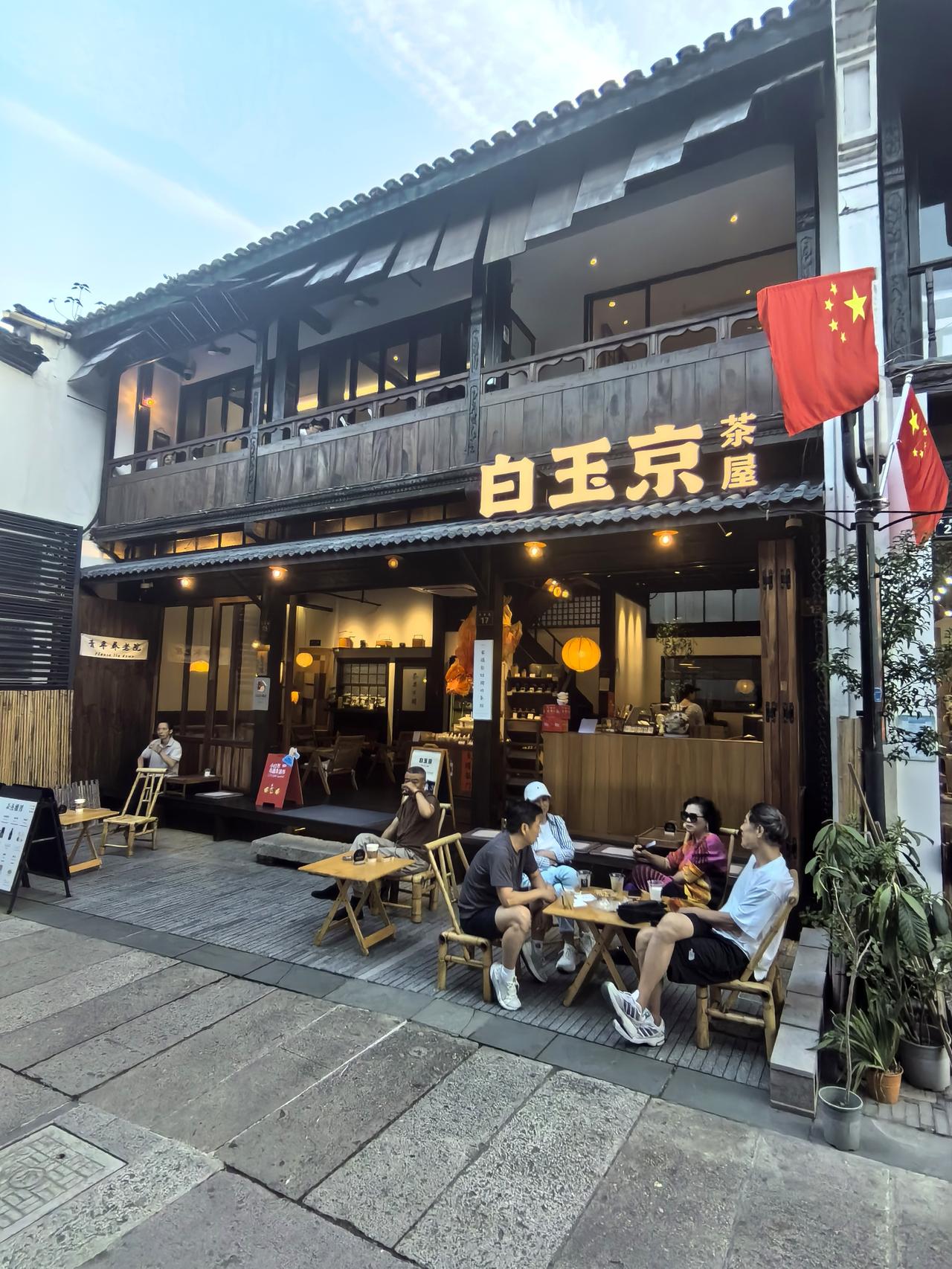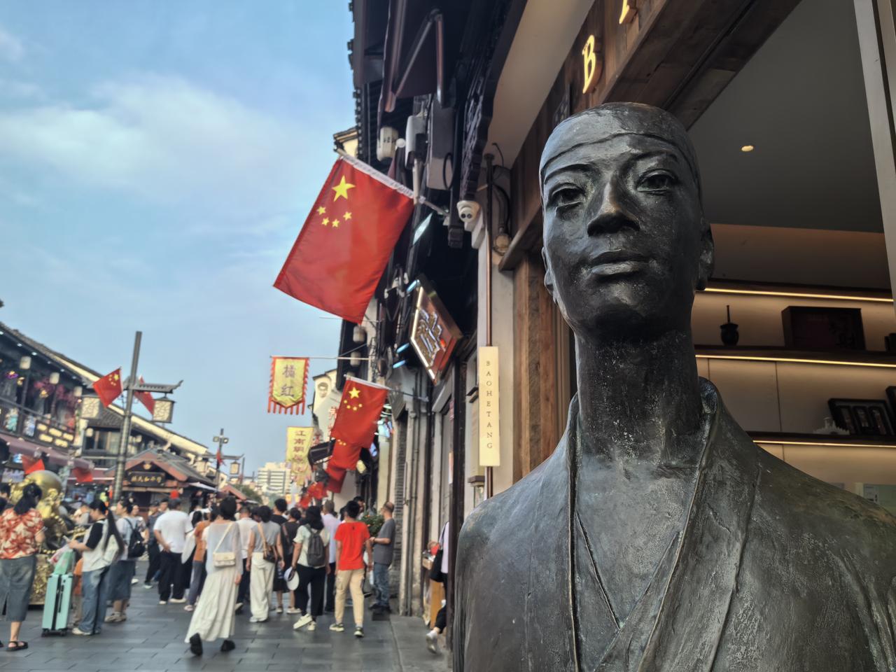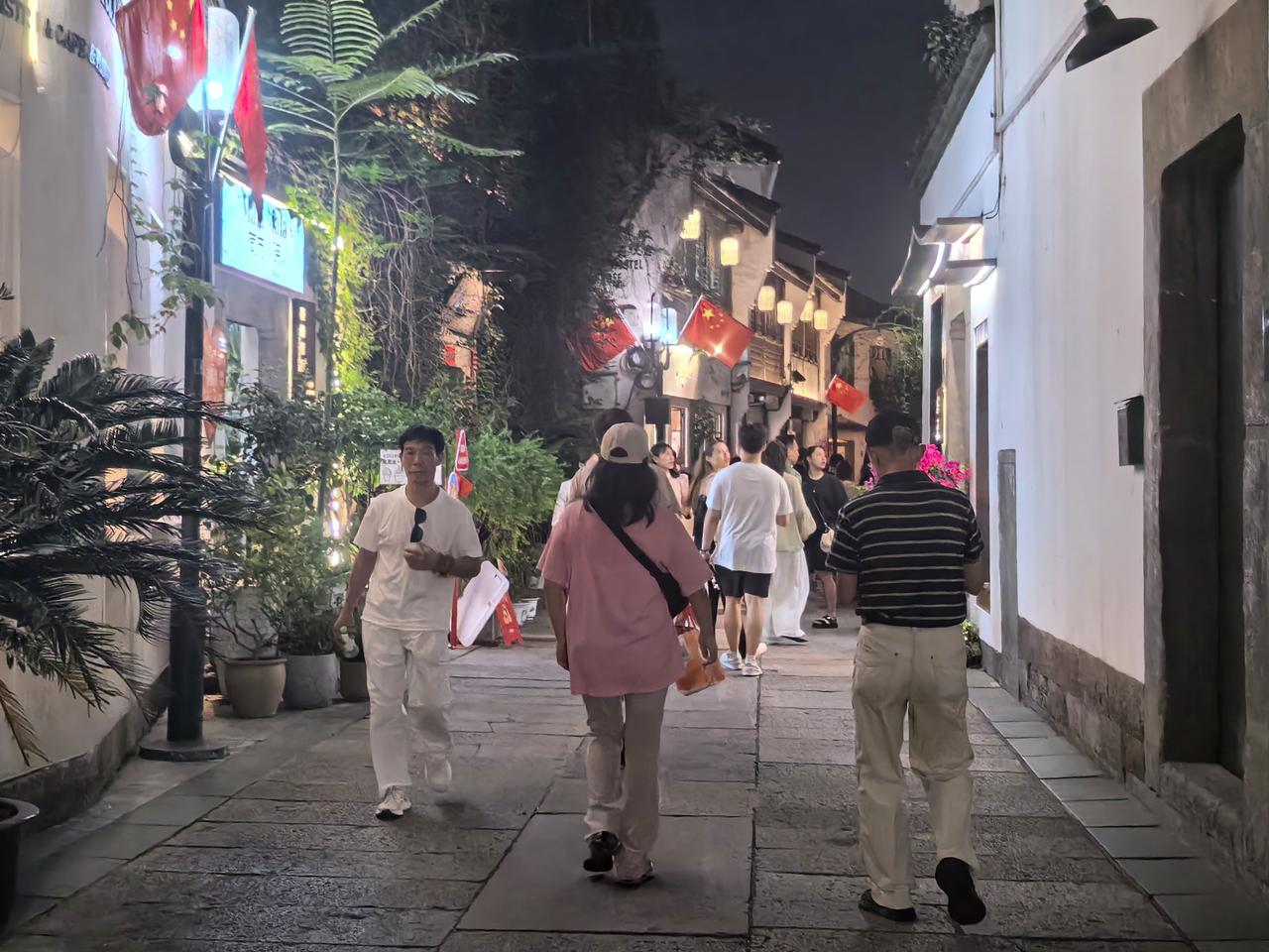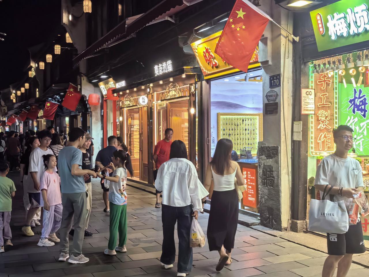七律·河坊街国庆所见 粉墙黛瓦国旗红, 还活千年宋韵风。 酒旆铺前迎远客, 檐头云淡挂晴空。 匠人细琢奇思器, 游伴招携放意翁。【注】 最是良宵灯似海, 笙歌一片满城中。 【注】游伴,指老伴;放意翁,作者自嘲。