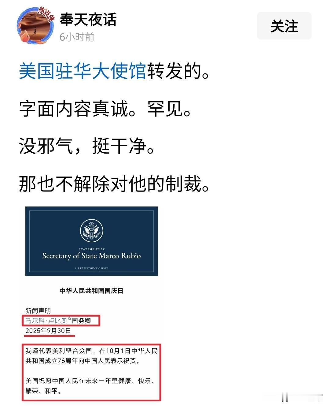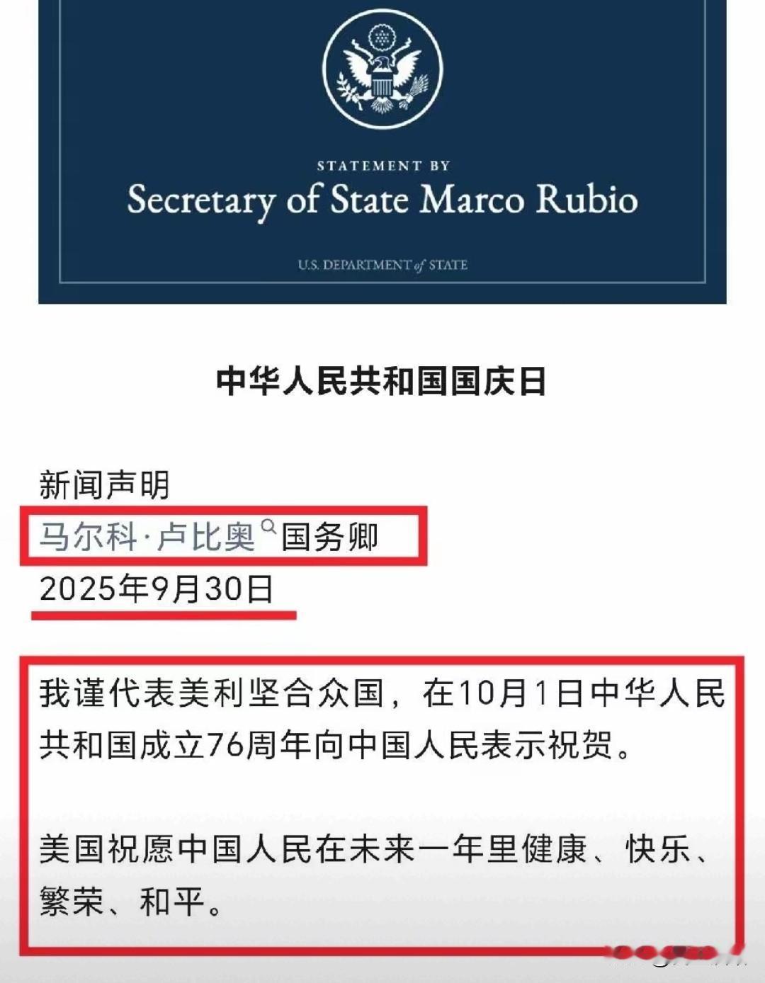 鲁比奥发个国庆祝贺,我国左右两派中某些人都嗨了,各自解读,都在扯淡,实际上根本就