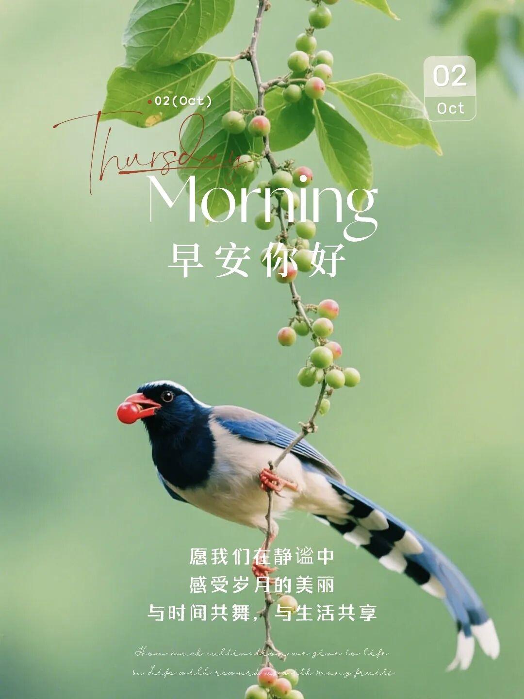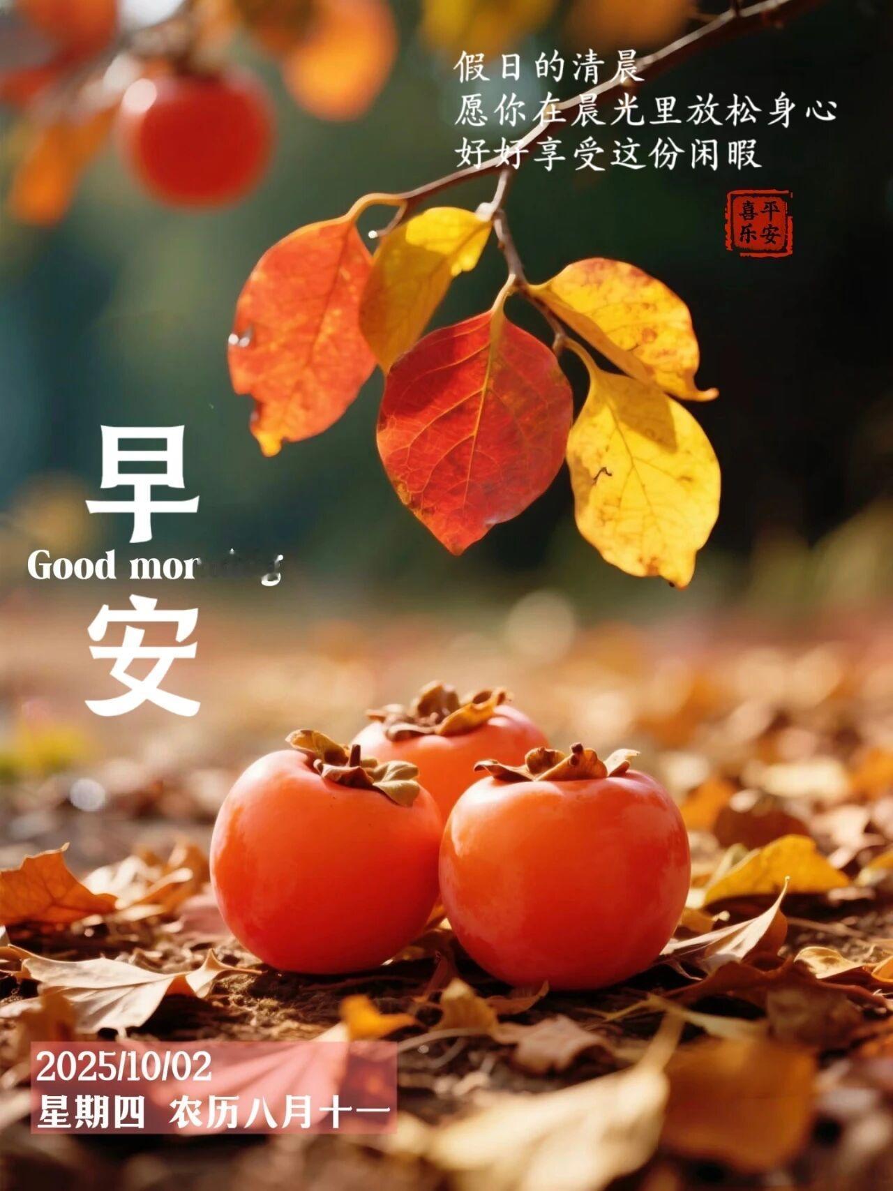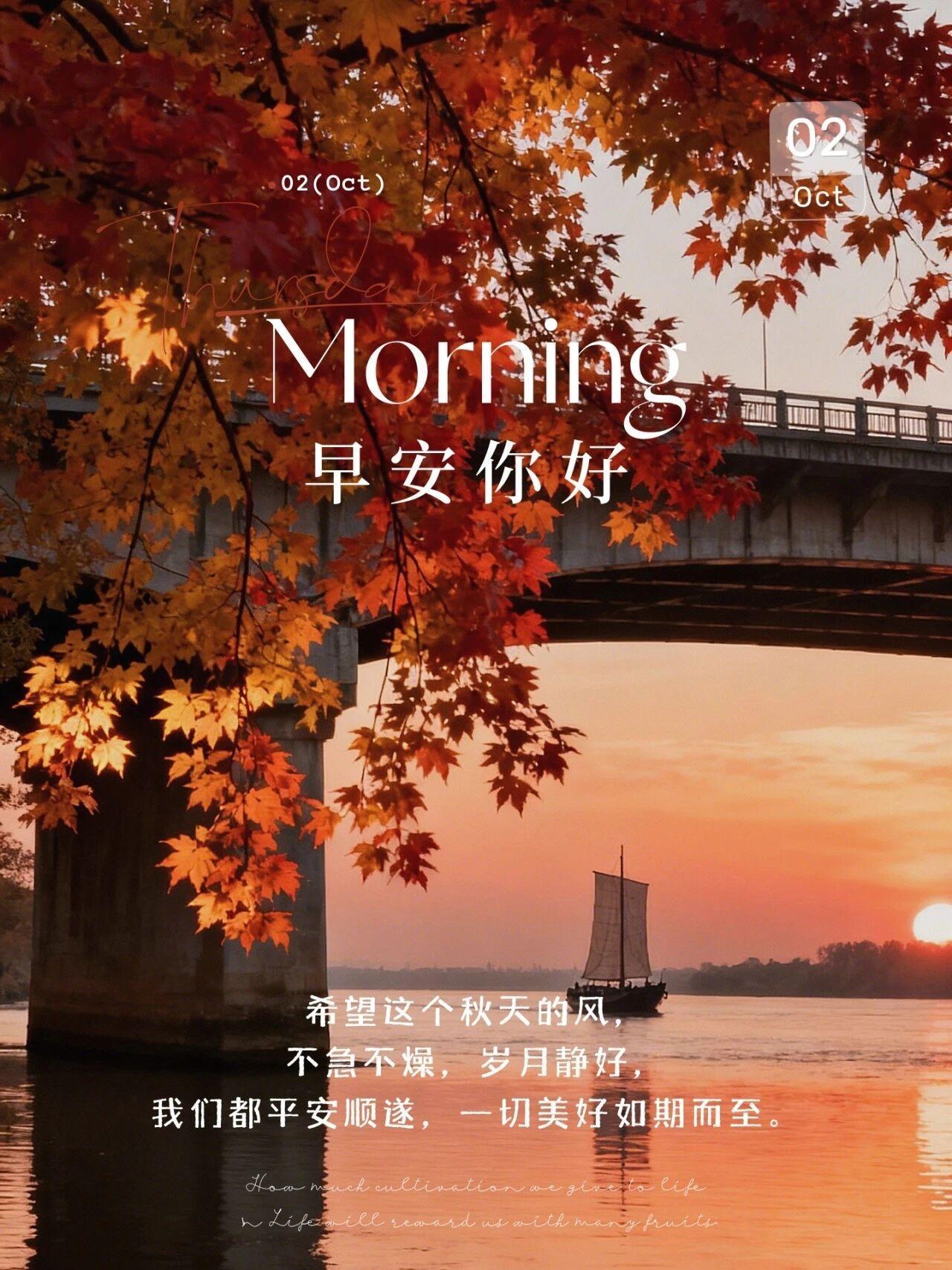 ❤️ᵕ̈𝐌𝐨𝐫𝐧𝐢𝐧𝐠🍂早安 时光静好秋意浓,山河锦绣映霞红。 在这静好的秋光里,每个清晨都饱含着家国的温暖与祝福。问一声早安,道一声珍重,愿盛世长歌伴您行,花好月圆人安康。假期第二天愉快🌿 晨语祝福美图 早安 早安今天 打卡早安心语 早安心语 秋日早安语 初秋早安