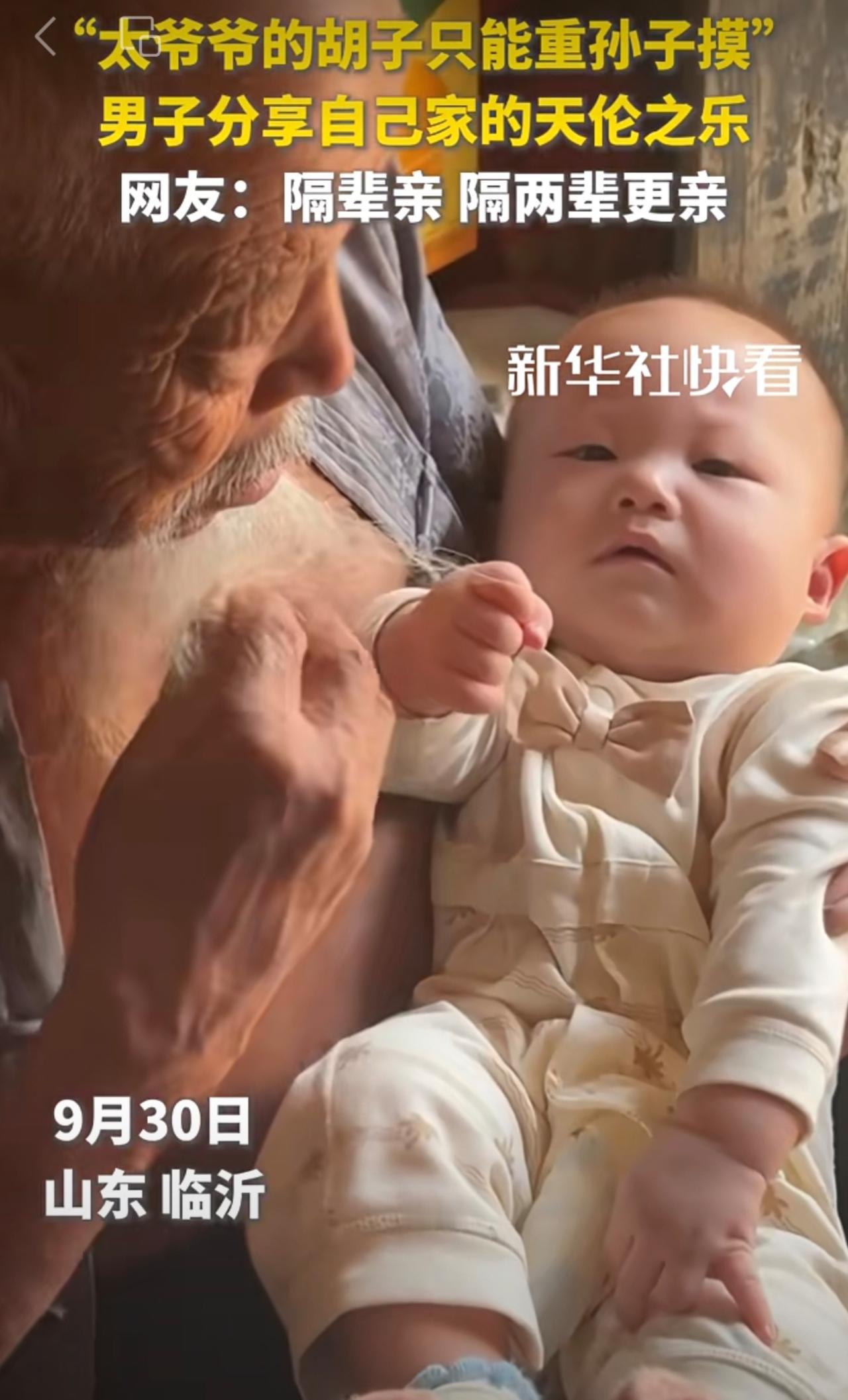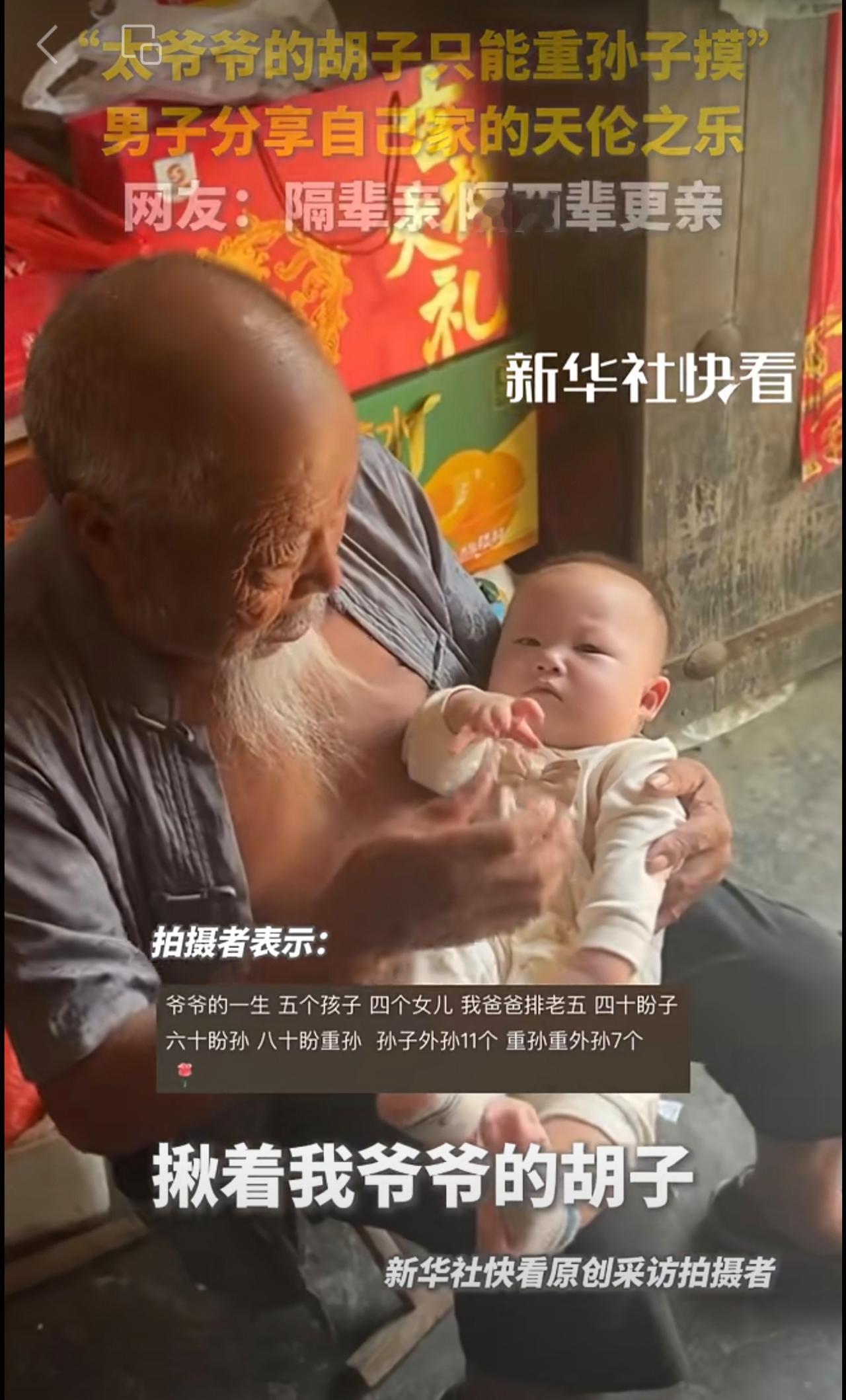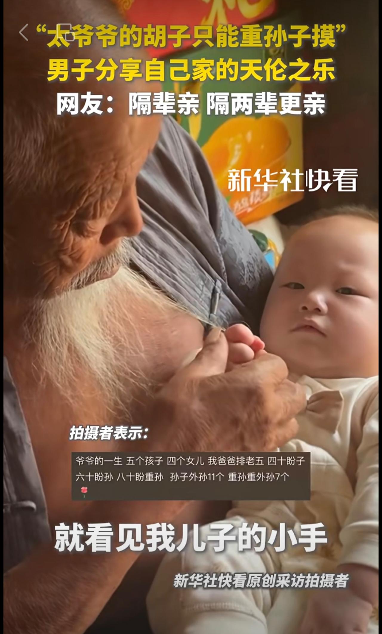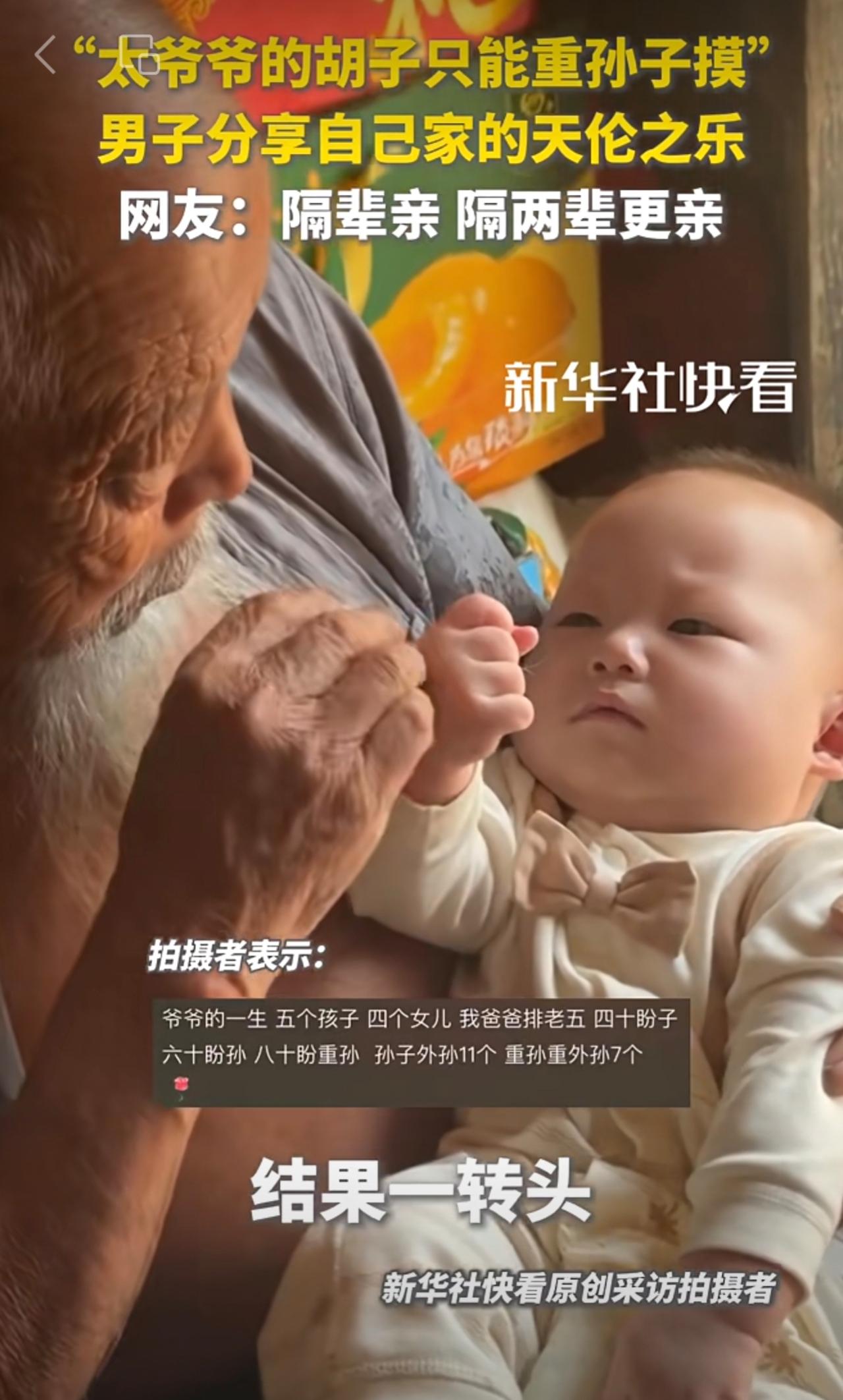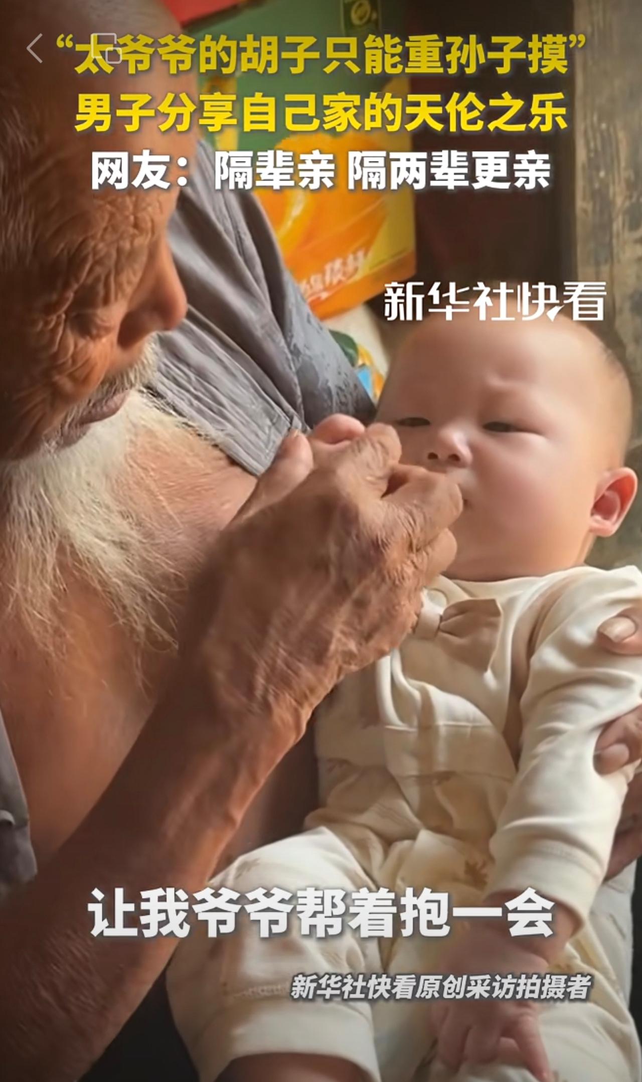 “太爷爷的胡子只能重孙子摸”。男子分享自己家的天伦之乐。网友:隔辈亲,隔两辈更亲!