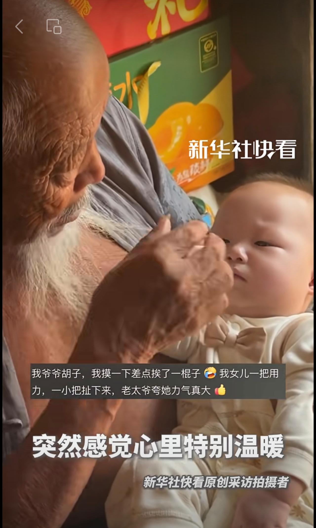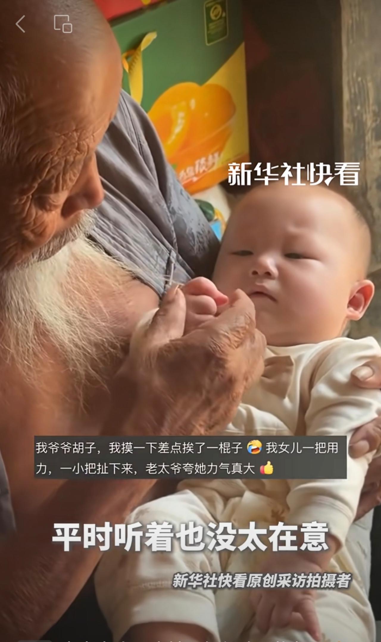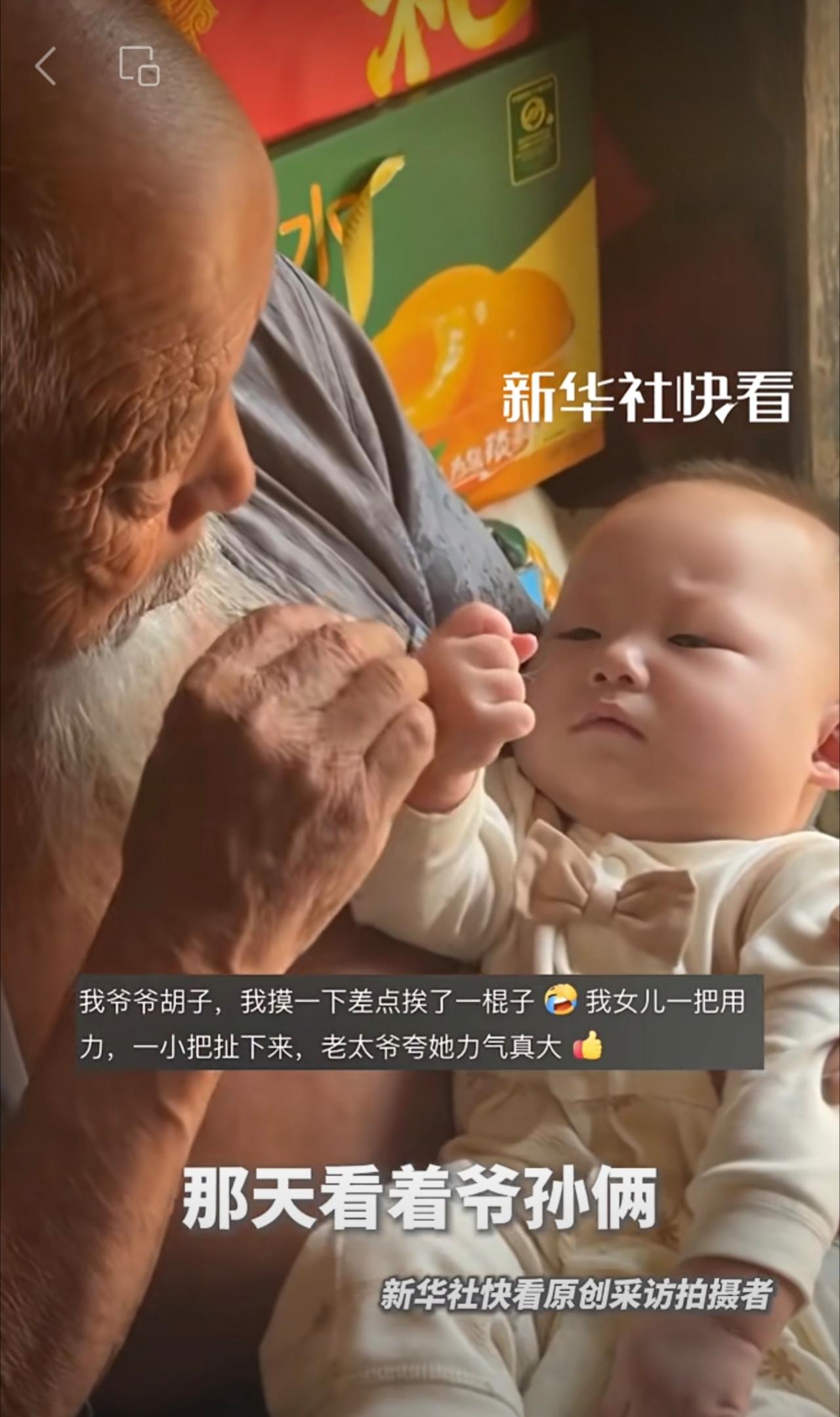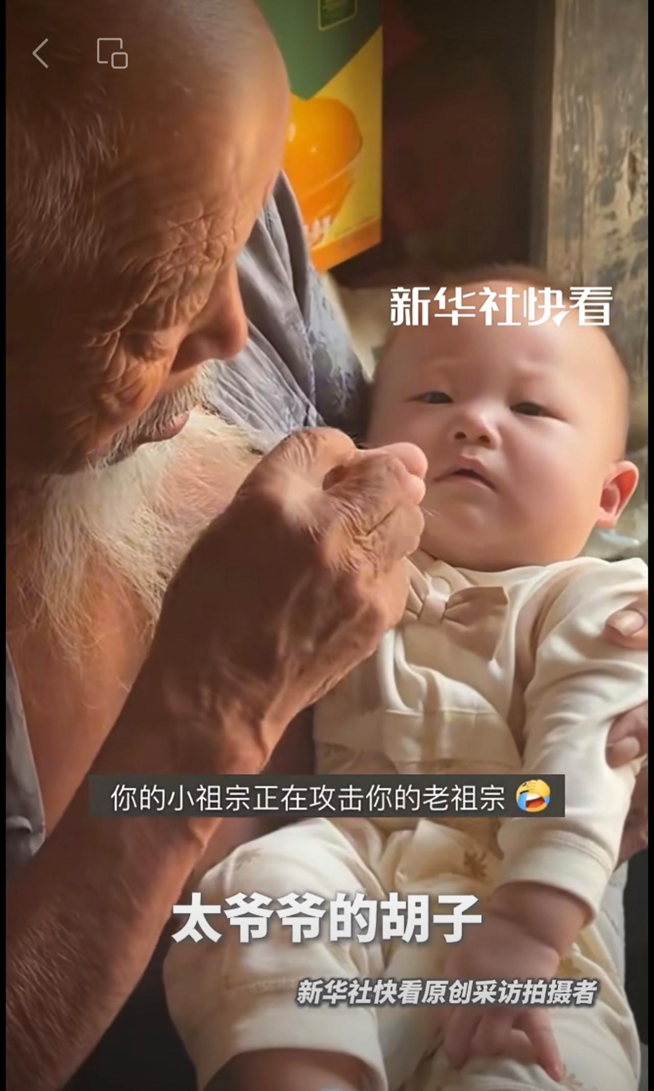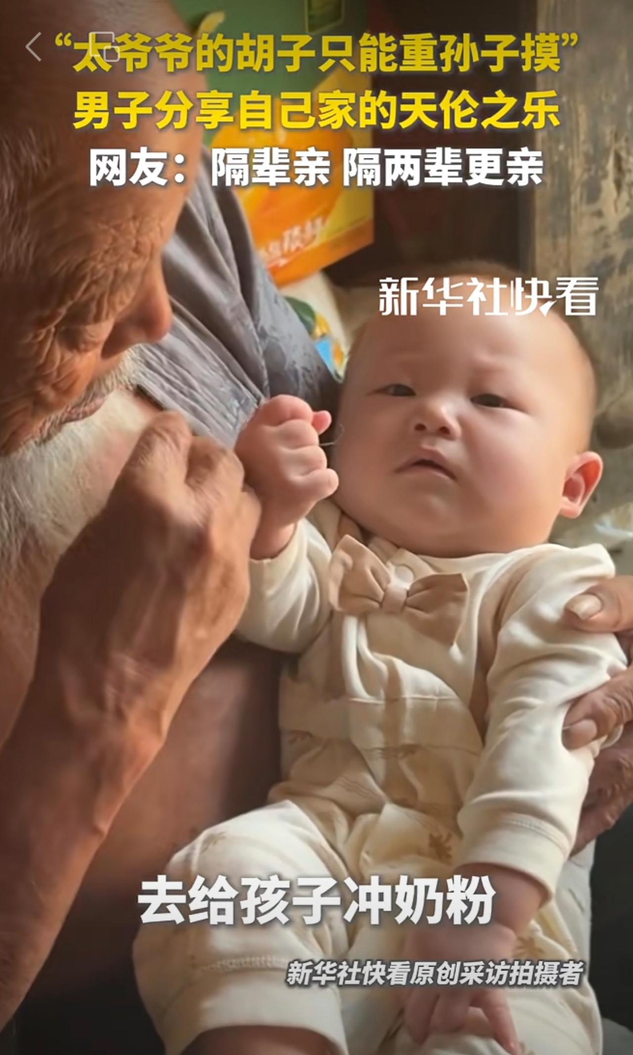 “太爷爷的胡子只能重孙子摸”。男子分享自己家的天伦之乐。网友:隔辈亲,隔两辈更亲!