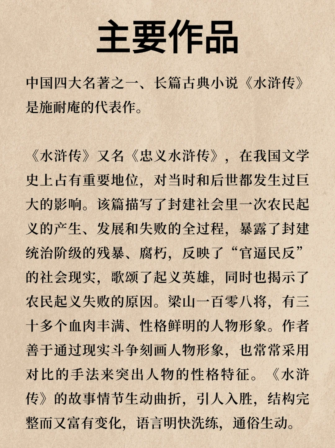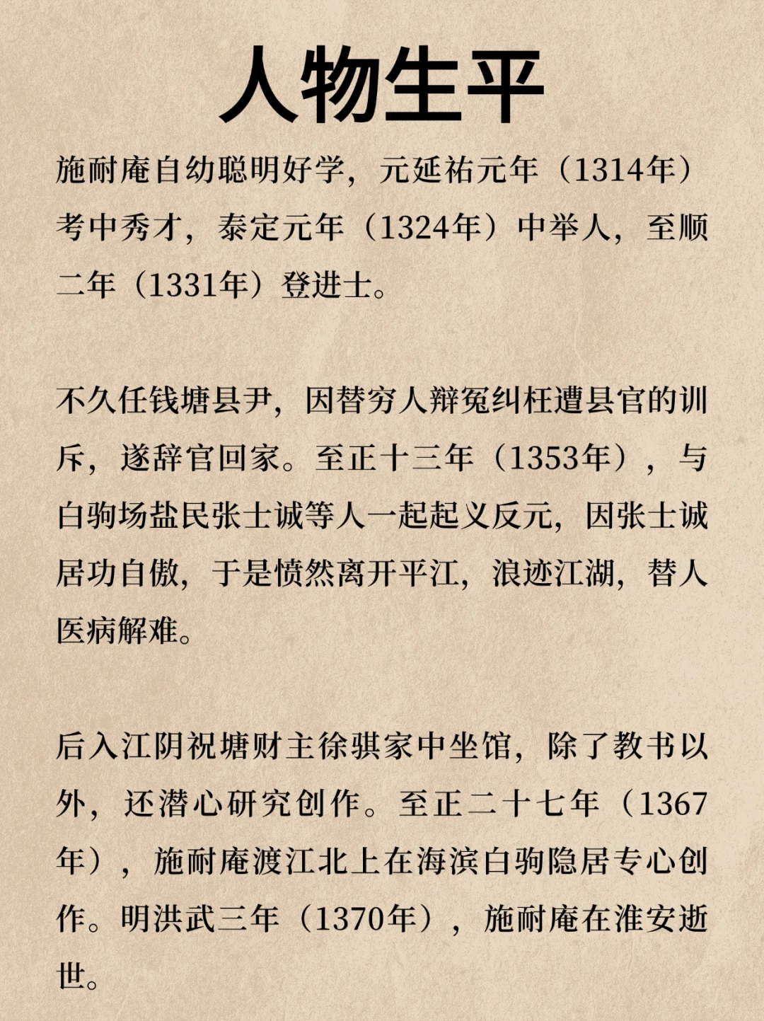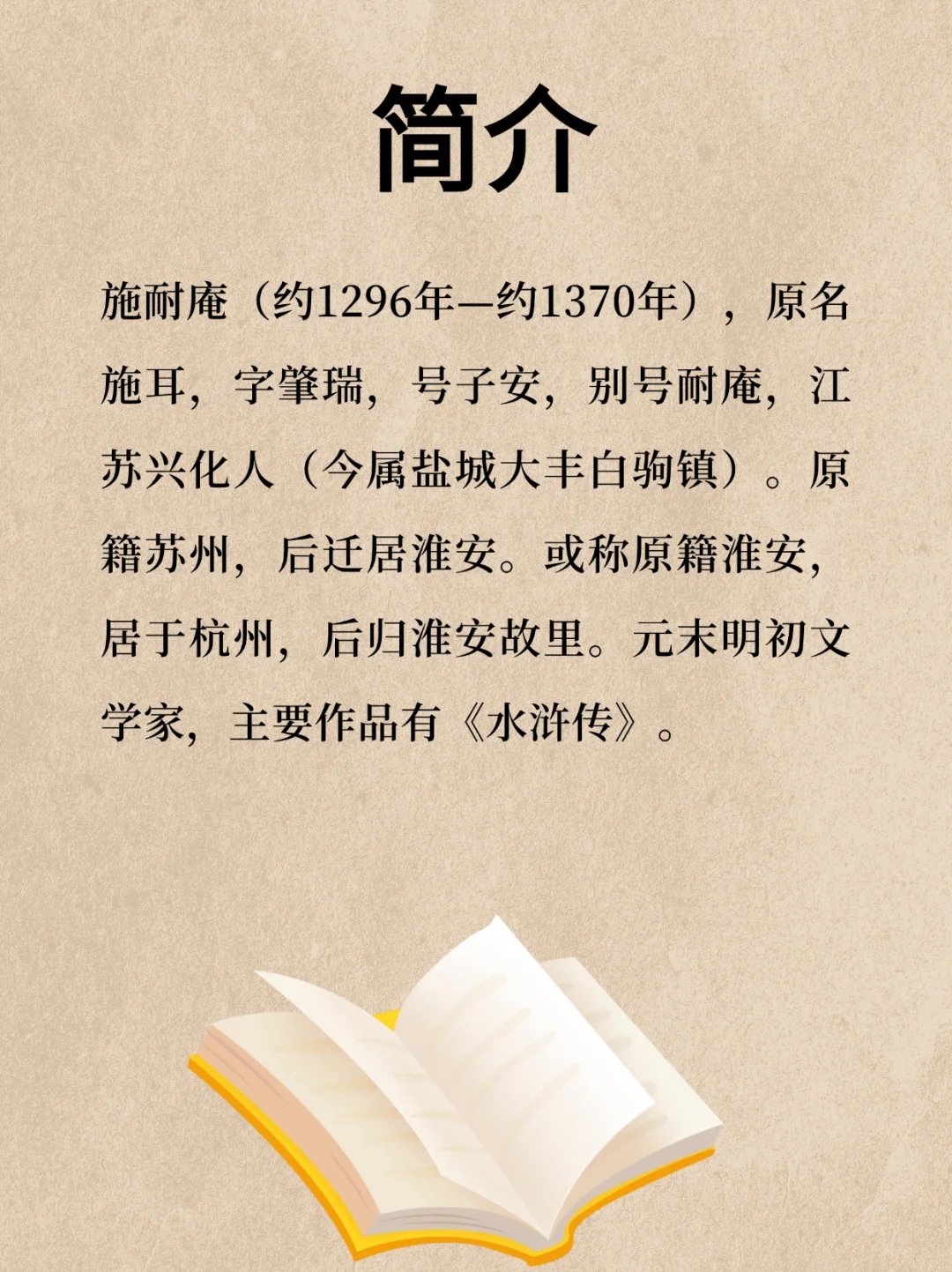 [私信R]施耐庵(约1296年-约1370年),原名施耳,字肇瑞,号子安,别号施庵,江苏兴化人(今属盐城大丰白驹镇)。原籍苏州,后迁居淮安。或称原籍淮安,居于杭州,后归淮安故里。元末明初文学家,主要作品《水浒传》。 施耐庵自幼聪明好学,元延佑年(1314年)考中秀才,泰定元年(1324年)中举人,至顺二年(1331年)登进士。 [种草R]至正二十七年(1367年),施耐庵渡江北上在海滨白驹隐居专心创作。明洪武三年(1370年),施耐庵在淮安逝世。 欢迎下方评论区补充-