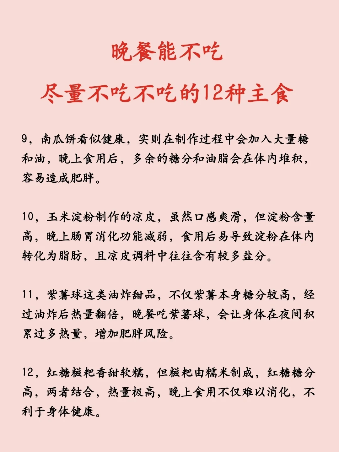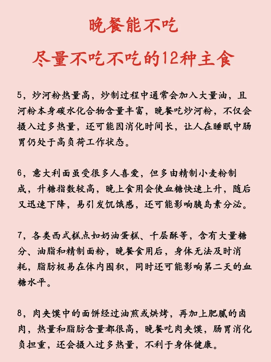 4.,油炸面饼如油饼、油条不要出现在晚餐餐桌,它们经高温油炸,油脂含量高,热量爆表,晚上人体代谢减缓,难以消耗这些高热量食物,多余热量易转化为脂肪堆积。