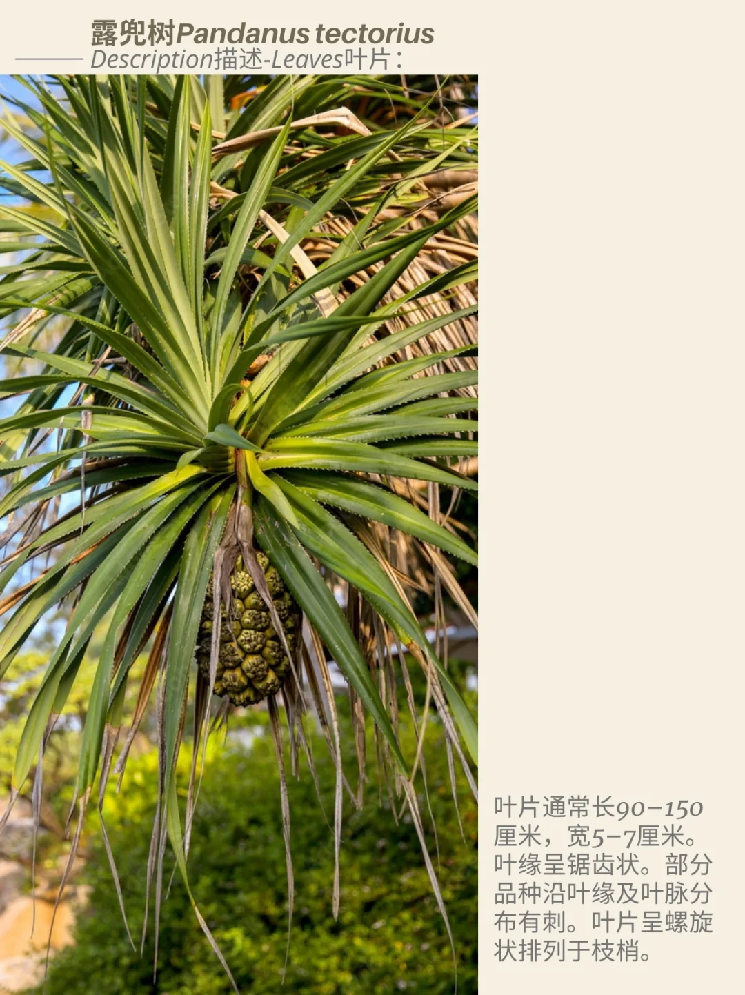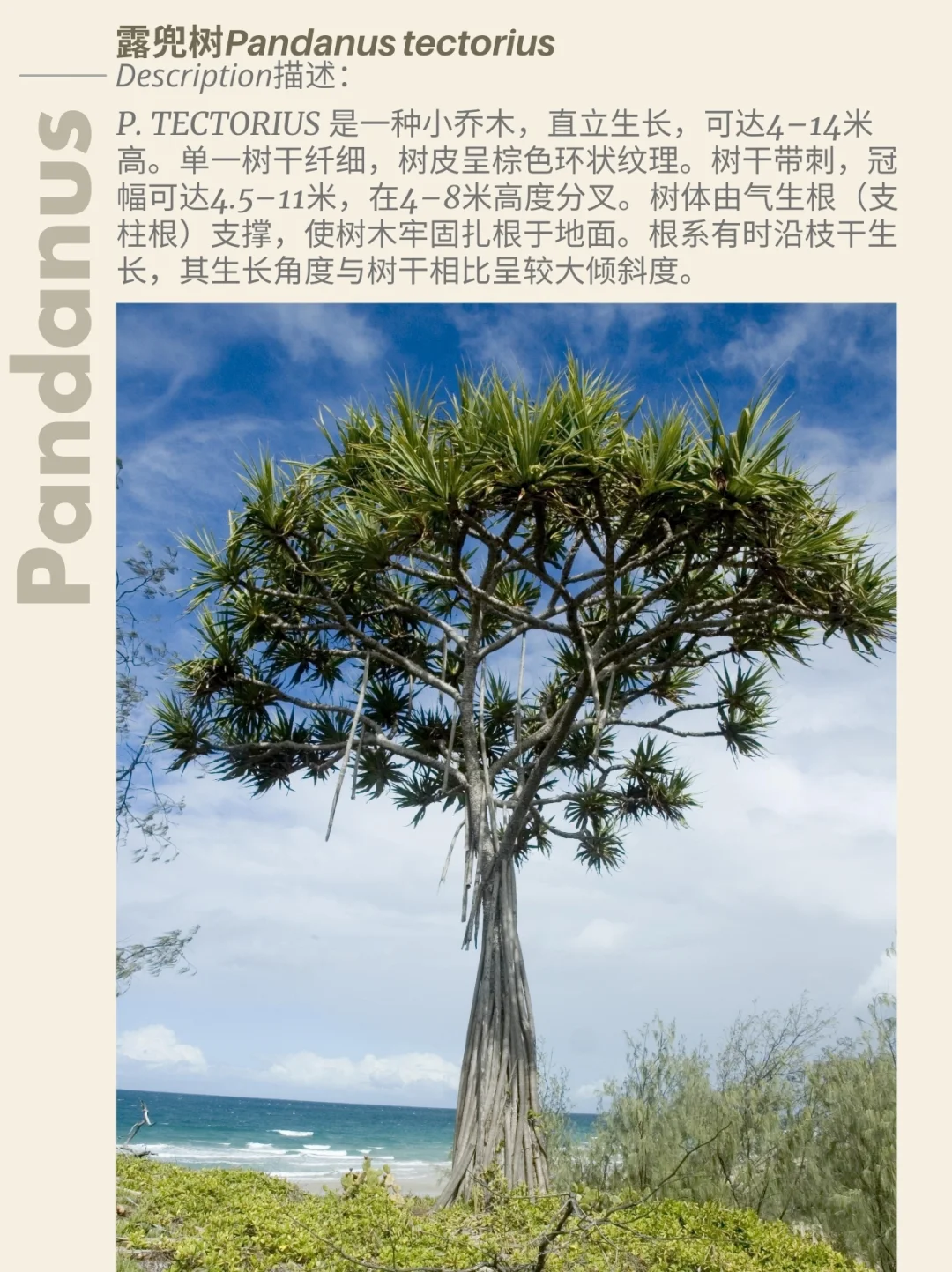 P. tectorius 是一种小乔木,直立生长,可达4–14米高。单一树干纤细,树皮呈棕色环状纹理。树干带刺,冠幅可达4.5–11米,在4–8米高度分叉。树体由气生根(支柱根)支撑,使树木牢固扎根于地面。根系有时沿枝干生长,其生长角度与树干相比呈较大倾斜度。