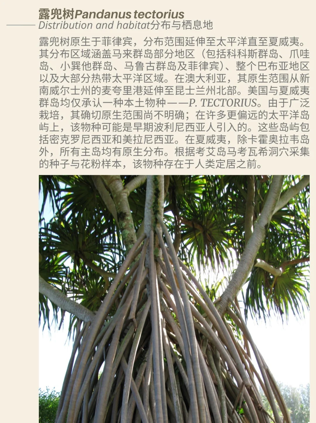 露兜树原生于菲律宾,分布范围延伸至太平洋直至夏威夷。其分布区域涵盖马来群岛部分地区(包括科科斯群岛、爪哇岛、小巽他群岛、马鲁古群岛及菲律宾)、整个巴布亚地区以及大部分热带太平洋区域。在澳大利亚,其原生范围从新南威尔士州的麦夸里港延伸至昆士兰州北部。美国与夏威夷群岛均仅承认一种本土物种——P. tectorius。由于广泛栽培,其确切原生范围尚不明确;在许多更偏远的太平洋岛屿上,该物种可能是早期波利尼西亚人引入的。这些岛屿包括密克罗尼西亚和美拉尼西亚。在夏威夷,除卡霍奥拉韦岛外,所有主岛均有原生分布。根据考艾岛马考瓦希洞穴采集的种子与花粉样本,该物种存在于人类定居之前。
