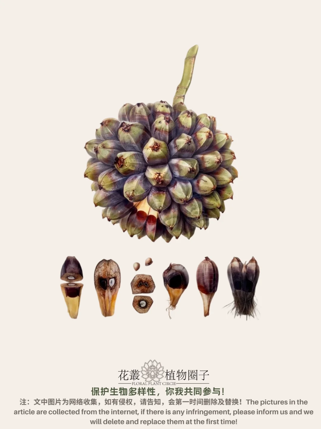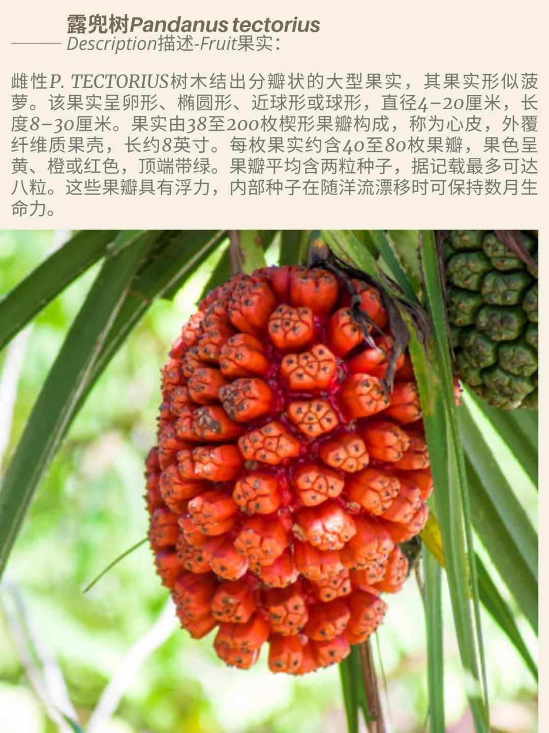 雌性P. tectorius树木结出分瓣状的大型果实,其果实形似菠萝。该果实呈卵形、椭圆形、近球形或球形,直径4–20厘米,长度8–30厘米。果实由38至200枚楔形果瓣构成,称为心皮,外覆纤维质果壳,长约8英寸。每枚果实约含40至80枚果瓣,果色呈黄、橙或红色,顶端带绿。果瓣平均含两粒种子,据记载最多可达八粒。这些果瓣具有浮力,内部种子在随洋流漂移时可保持数月生命力。