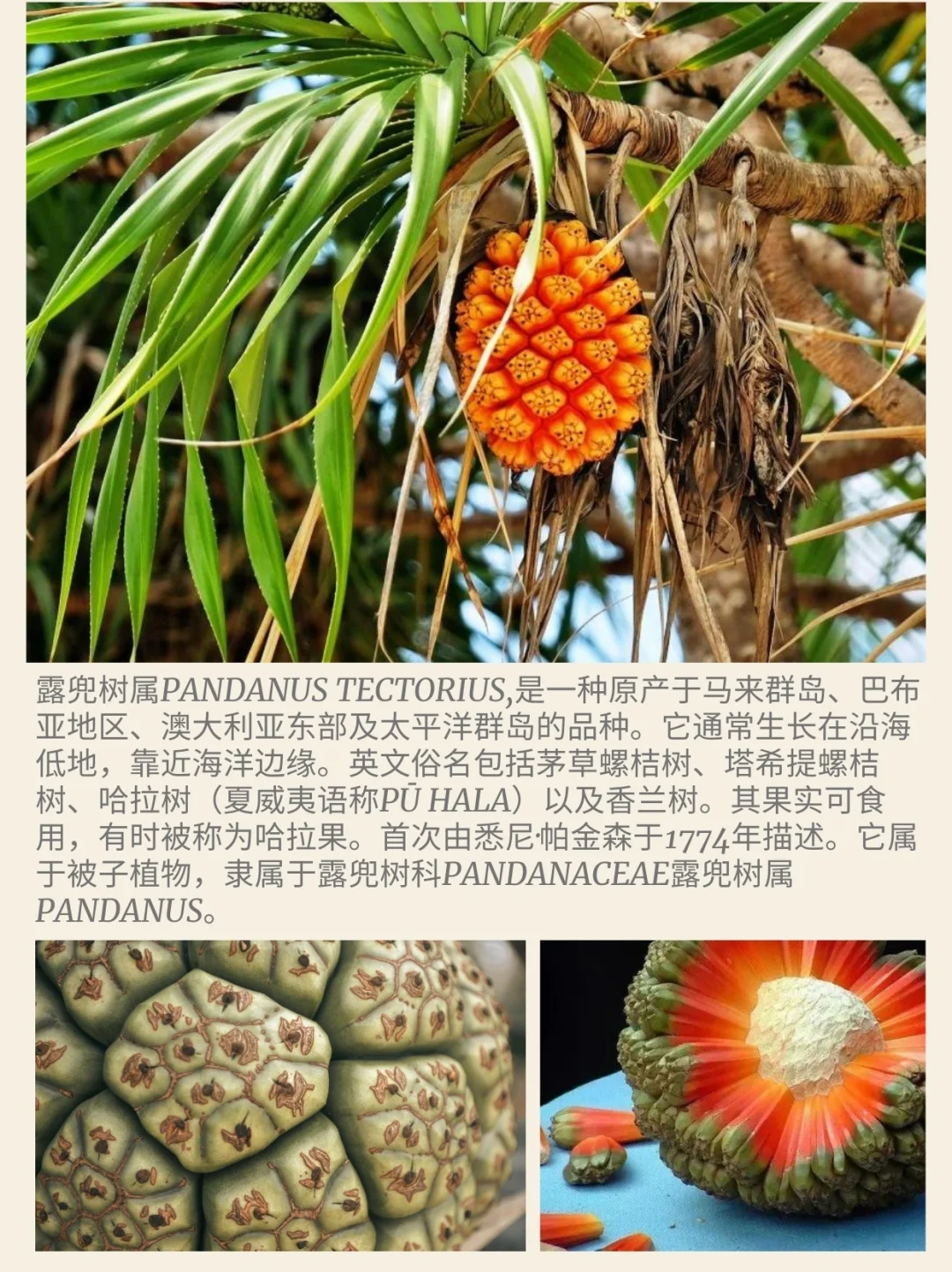 热带水果 露兜树 马来群岛 澳大利亚 水果 雌雄异株 果树 露兜树属Pandanus tectorius,是一种原产于马来群岛、巴布亚地区、澳大利亚东部及太平洋群岛的品种。它通常生长在沿海低地,靠近海洋边缘。英文俗名包括茅草螺桔树、塔希提螺桔树、哈拉树(夏威夷语称pū hala)以及香兰树。其果实可食用,有时被称为哈拉果。