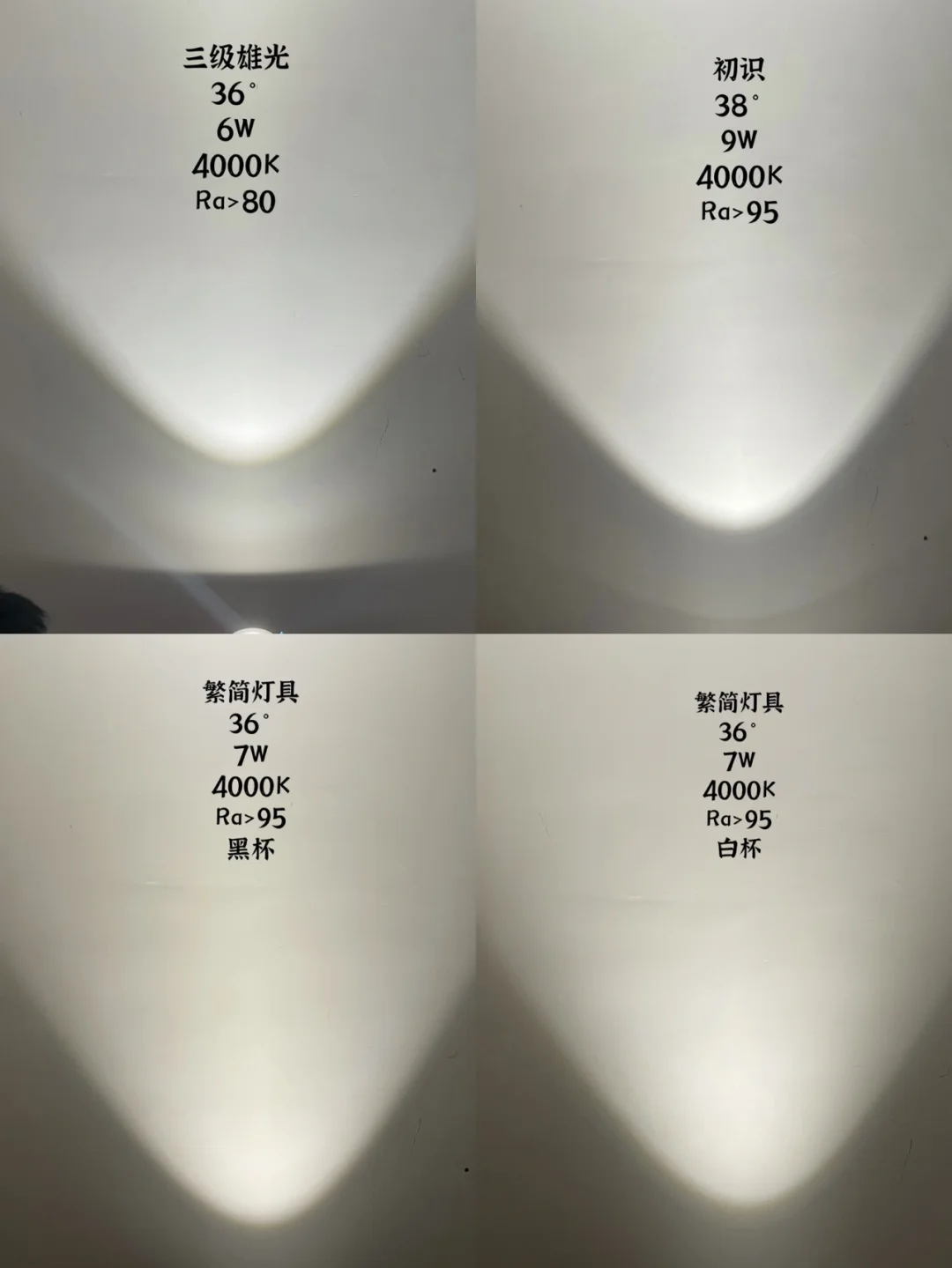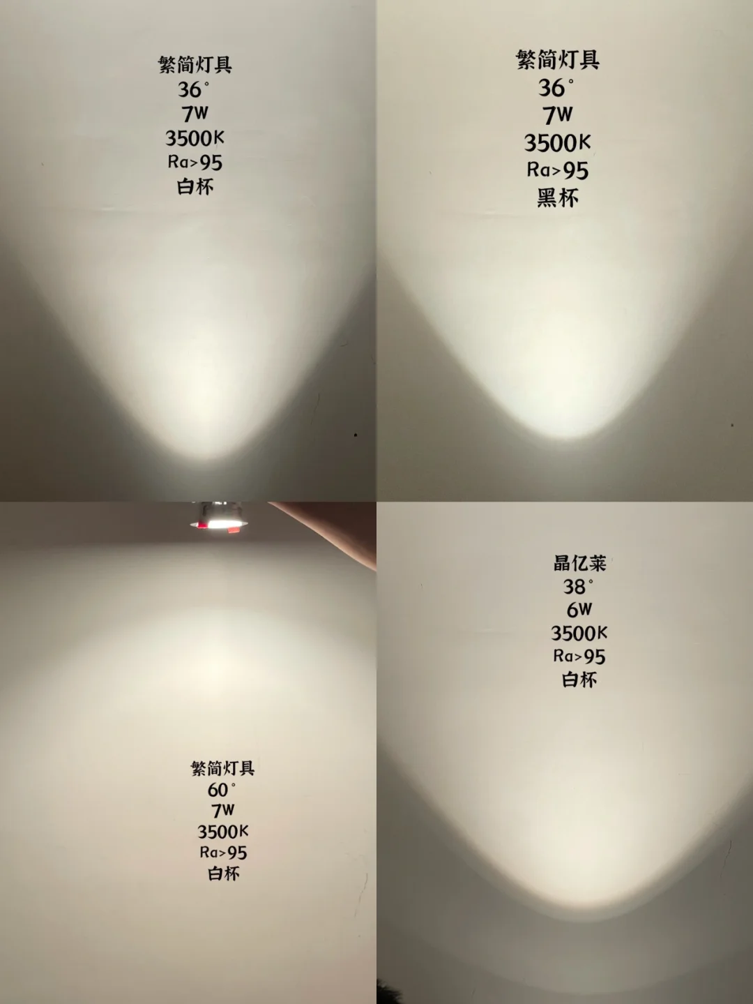 🏷繁简(89💰)的质感很好,无杂光,小山丘明显,据说,射灯的黑杯比白杯防眩,但图二三四个灯的对比,我肉眼并没有看出什么大的区别,我觉得区别可能是大家喜欢屋顶是黑色的灯洞还是白色的区别❗️