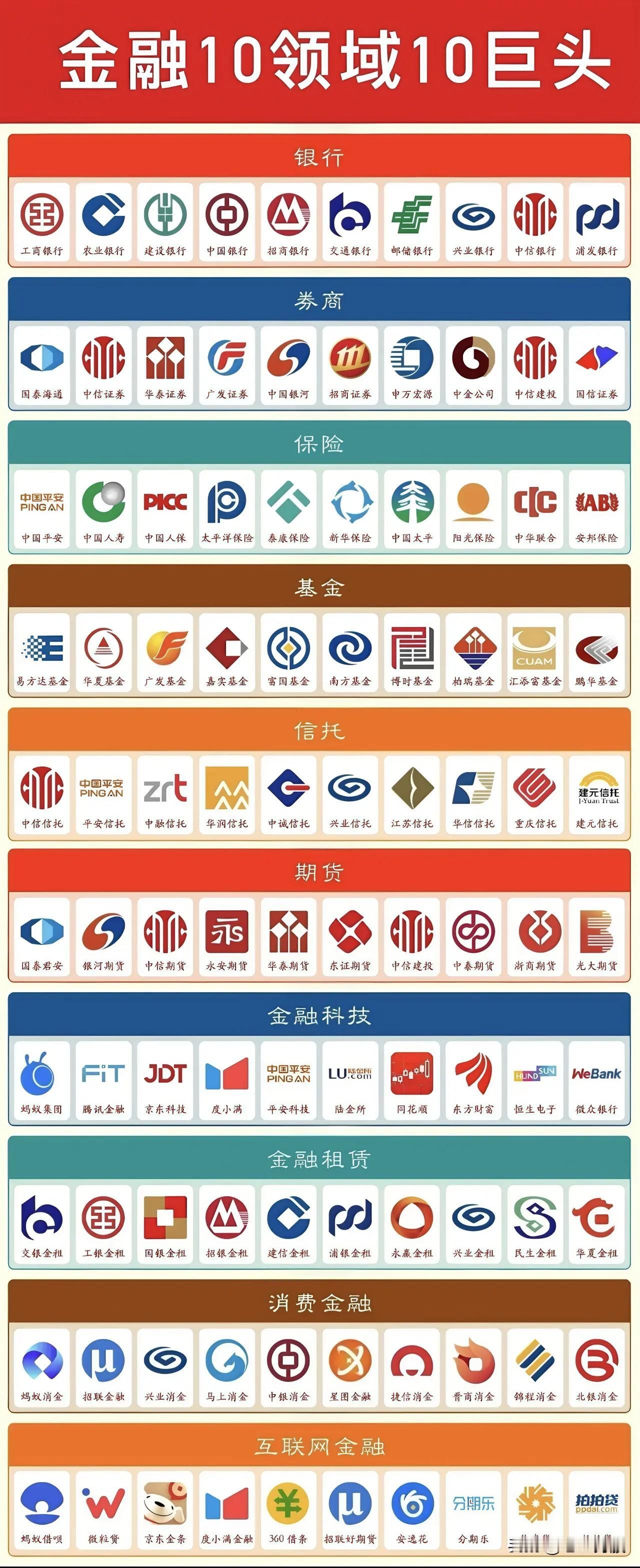 以下内容展示了金融10个领域各自对应的10巨头,涵盖银行(如工商银行等)、券商(如国泰君安等)、保险(如中国平安等)、基金(如易方达基金等)、信托(如中信信托等)、期货(如国泰君安等)、金融科技(如蚂蚁集团等)、金融租赁(如交银金租等)、消费金融(如蚂蚁消金等)、互联网金融(如蚂蚁借呗等)领域及其代表性企业。