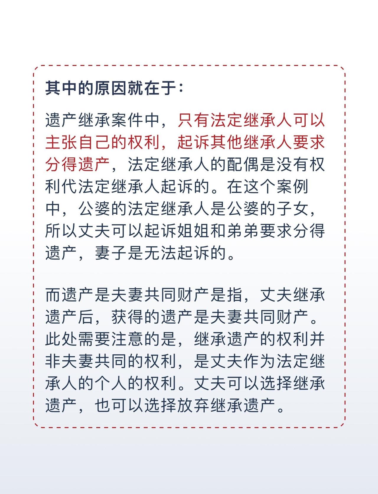 我们发现有姐妹问这样的问题!! ➡️ 公婆去世,丈夫的姐姐和弟弟自说自话拿了公婆的遗产没有分给丈夫,丈夫比较重情义也不愿意去要。妻子认为丈夫获得的遗产是夫妻共同财产,所以想去起诉丈夫的姐姐和弟弟,要回丈夫应得的公婆的遗产。 然而,这个妻子的想法和做法看似合理,但其实是无法执行的! 其中的原因就在于⬇️ ✨ 遗产继承案件中,只有法定继承人可以主张自己的权利,起诉其他继承人要求分得遗产,法定继承人的配偶是没有权利代法定继承人起诉的。在这个案例中,公婆的法定继承人是公婆的子女,所以丈夫可以起诉姐姐和弟弟要求分得遗产,妻子是无法起诉的。 ✨ 而遗产是夫妻共同财产是指,丈夫继承遗产后,获得的遗产是夫妻共同财产。此处需要注意的是,继承遗产的权利并非夫妻共同的权利,是丈夫作为法定继承人的个人的权利。丈夫可以选择继承遗产,也可以选择放弃继承遗产。 [加油] 所以说,与其最后引起家庭纠纷,不如早点立遗嘱分配好遗产,选好遗嘱执行人落实好遗嘱! 趣味法律小知识 遗产继承 热点新闻事件