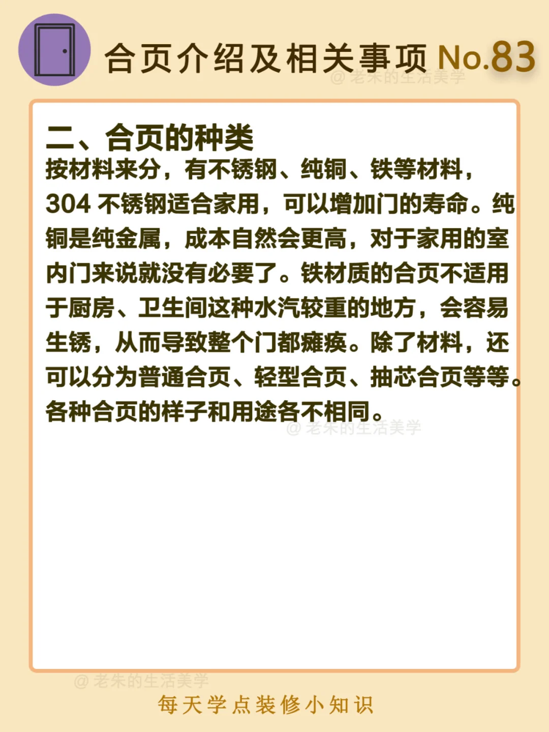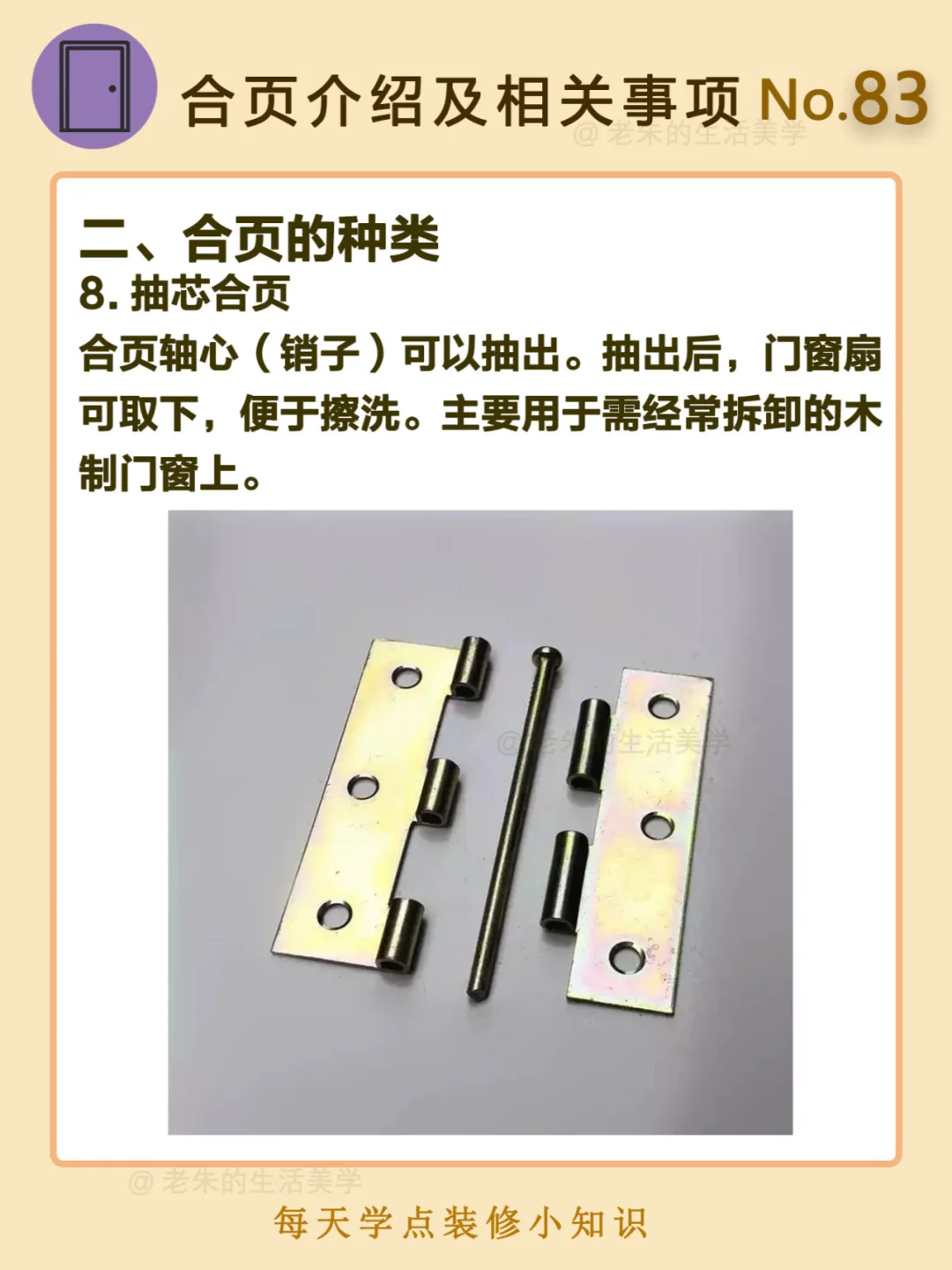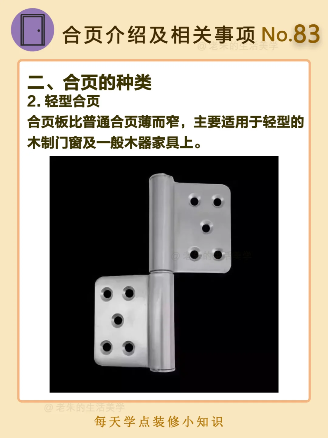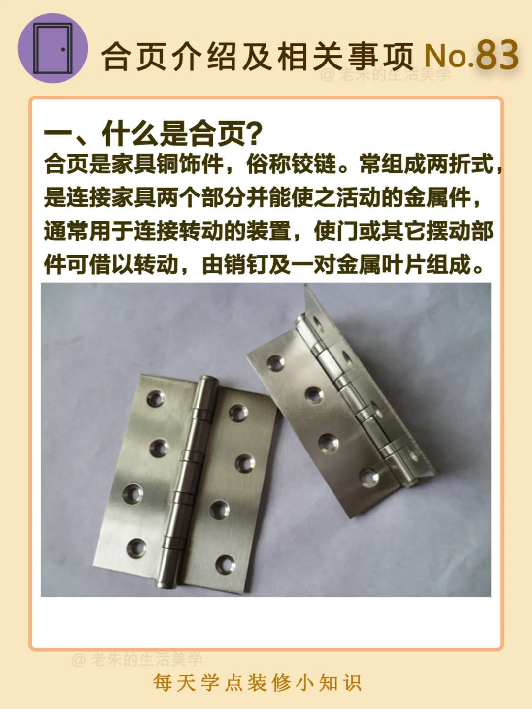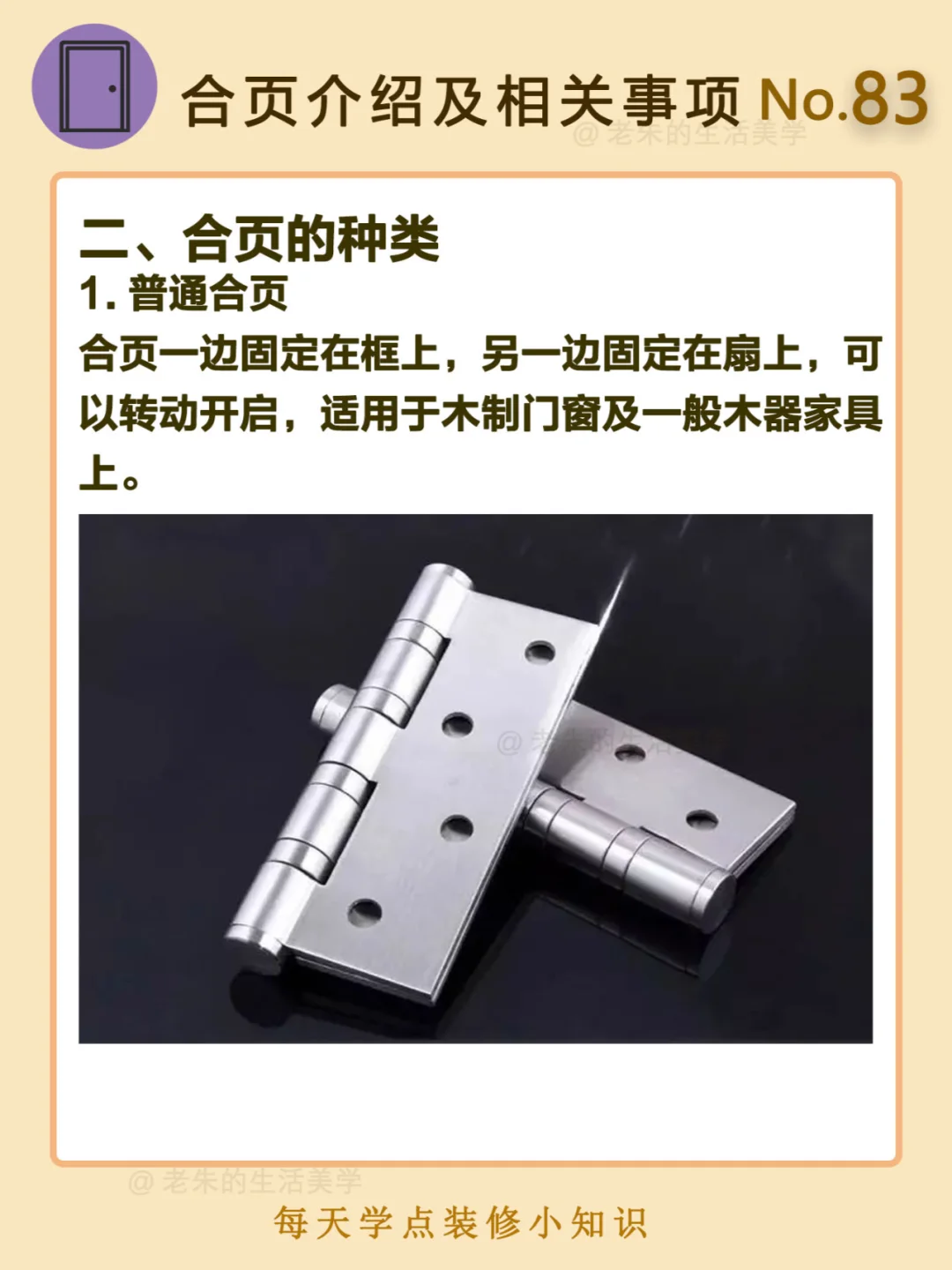 🔔 一、什么是合页 二、合页的种类 三、合页的数量 四、合页怎么选 🔆 我是老朱 📍坐标天津 前上市公司金牌工长🏅 30年施工经验🛠️ 承接天津新房装修/老房改造 精心整理关于设计&施工&装修的攻略📝 关注我每日更新🗓️ 也可以在评论区留下您宝贵的想法与建议💓 让您装修不走弯路✅