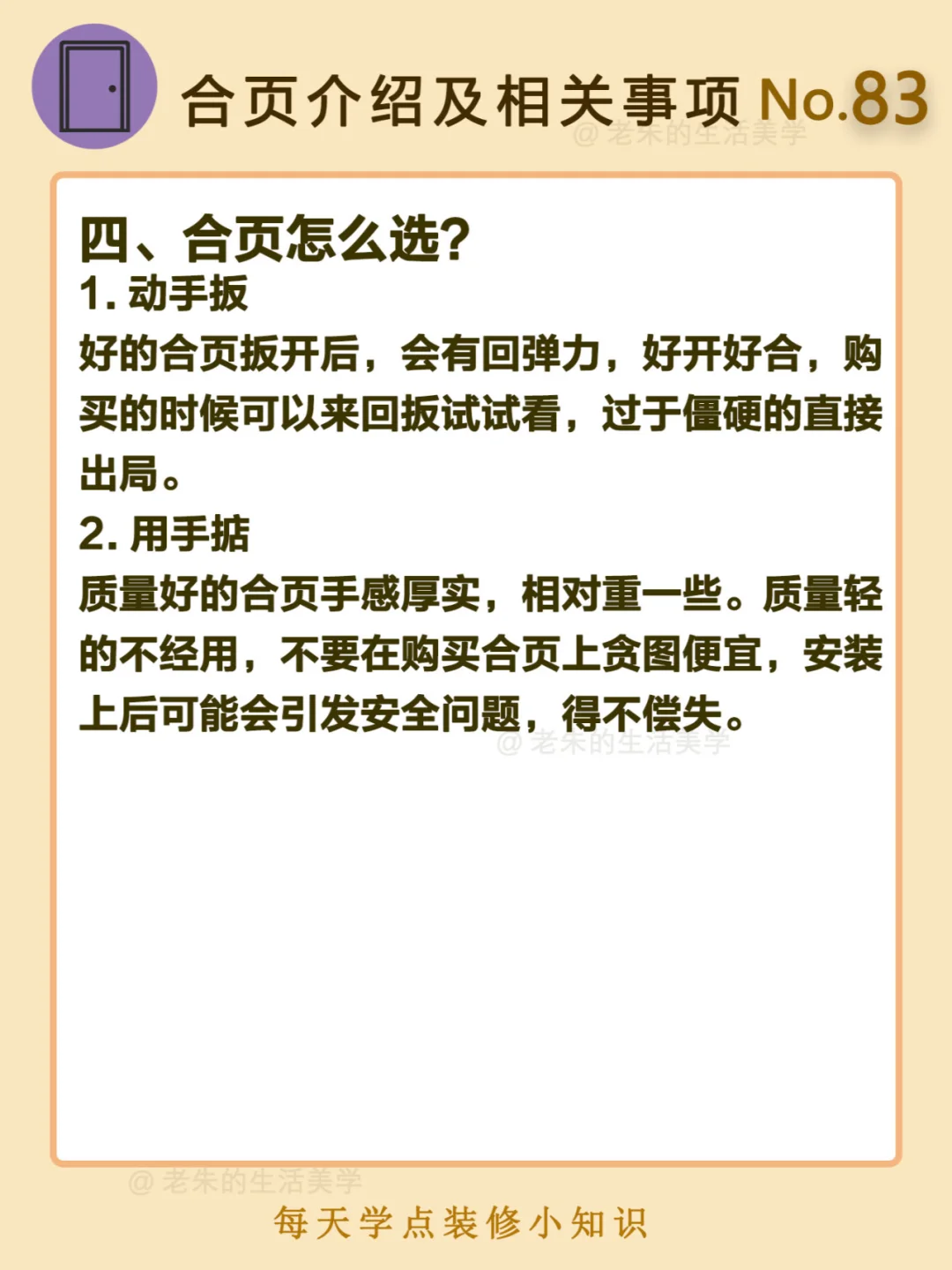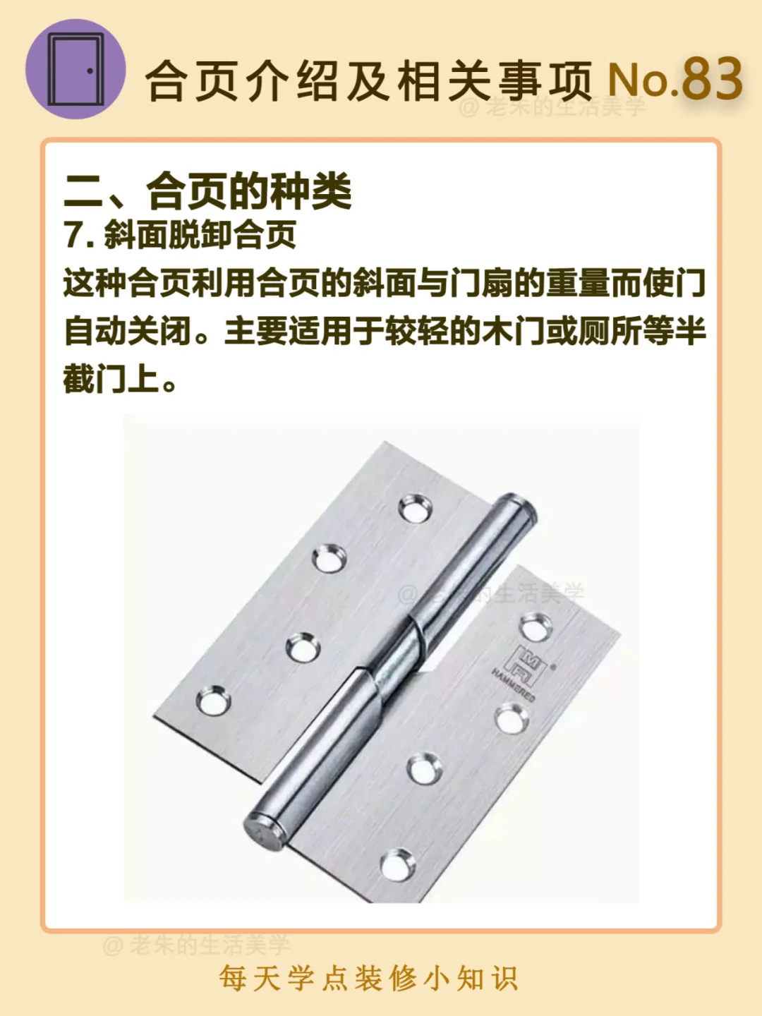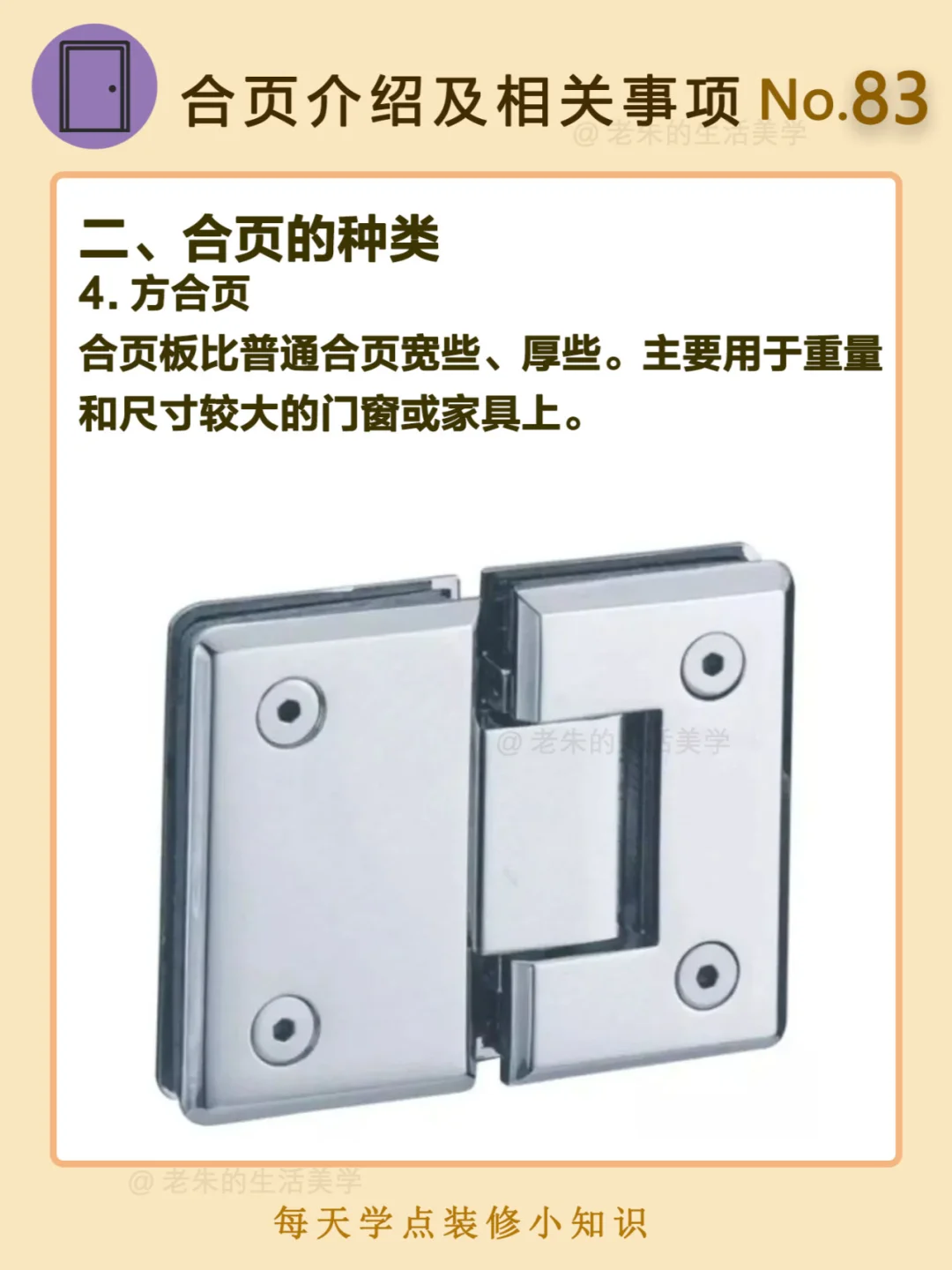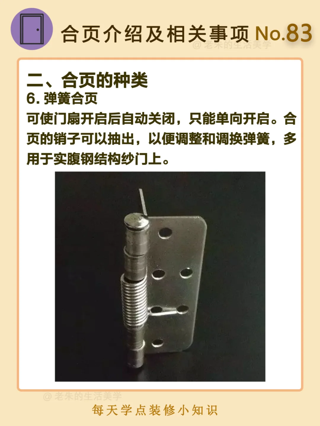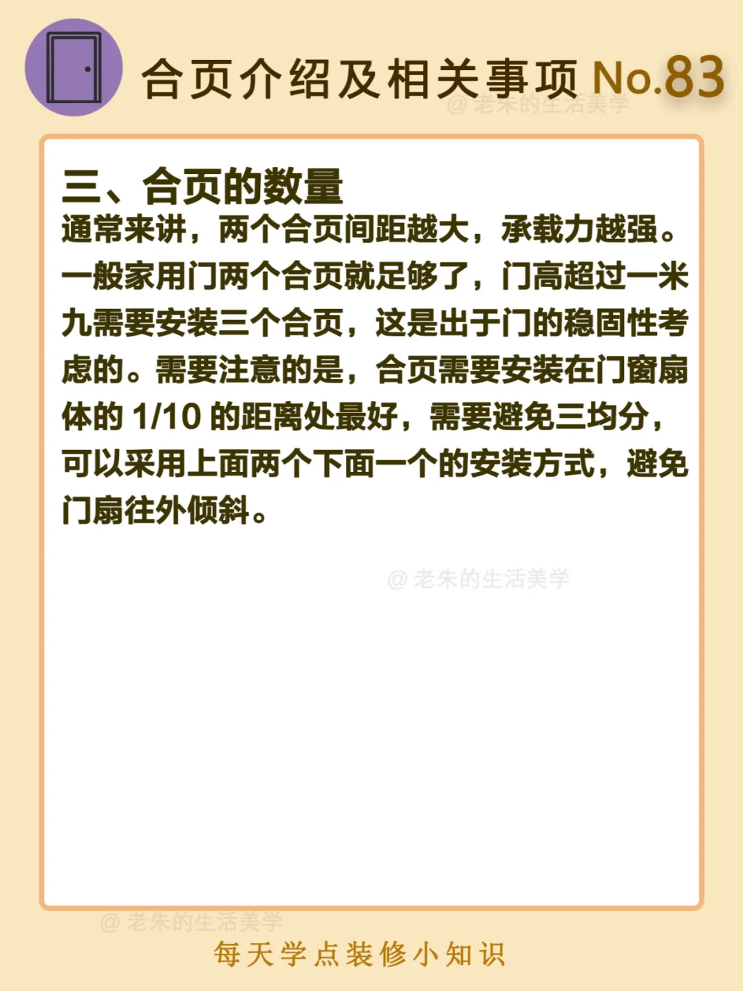 🔔 一、什么是合页 二、合页的种类 三、合页的数量 四、合页怎么选 🔆 我是老朱 📍坐标天津 前上市公司金牌工长🏅 30年施工经验🛠️ 承接天津新房装修/老房改造 精心整理关于设计&施工&装修的攻略📝 关注我每日更新🗓️ 也可以在评论区留下您宝贵的想法与建议💓 让您装修不走弯路✅