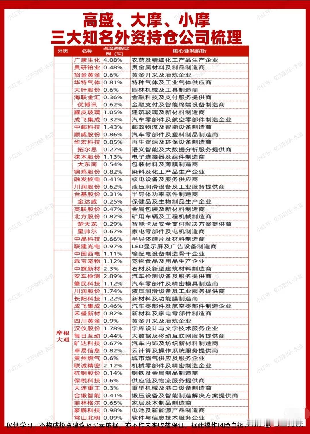 “高盛、大摩、小摩(即高盛、摩根士丹利、摩根大通)”这三大国际知名投资机构,在A股或中国上市公司中的持仓情况梳理,主要包含以下信息: - 豪威集团(图像传感器等半导体产品,持股比例0.93%) - 华测检测(国内第三方检测龙头,持股比例1.12%) - 太平洋(区域券商,经纪业务市占率领先,持股比例0.57%) - 利民股份(农药及精细化工,持股比例1.16%) - 和而泰(智能控制器及智能硬件,持股比例0.44%) - 弘业期货(期货及衍生品服务,持股比例1.44%) - 成飞集成(航空及汽车零部件,持股比例0.53%) - 中公教育(职业教育,持股比例0.37%) - 尤安设计(建筑设计咨询,持股比例1.9%,为高盛持仓比例最高的公司之一) - 影石创新(智能影像设备,持股比例1.21%) - 合锻智能(锻压及智能制造,持股比例0.78%) - 潍柴重机(柴油发动机,持股比例0.96%) - 大位科技(跨界布局IDC,目标互联网综合服务,持股比例0.5%) - 融发核电(核电设备,持股比例0.57%) - 御银股份(金融设备,持股比例0.94%) - 天利科技(金融科技及软件服务,持股比例0.78% / 另一处显示1.06%) - 晨曦航空(航空零部件,持股比例0.49%) - 深圳华强(电子元器件分销,持股比例0.17%) - 冰川网络(网络游戏,持股比例0.58%) - 赛伍技术(光伏材料,持股比例0.83%) - 伟时电子(汽车电子零部件,持股比例0.94%) - 新恒汇(智能卡芯片封装材料,持股比例1.65%) - 涛涛车业(越野摩托及电动车,持股比例1.4%) - 神驰机电(发电机及机电,持股比例0.74%) - 永鼎股份(光纤光缆,持股比例0.35%) - 锦鸡股份(染料化工,持股比例0.79% / 另一处也出现,持股0.82%) - 创新医疗(医疗设备及服务,持股比例0.64%) - 旭升集团(新能源汽车铝合金零部件,持股比例0.32% / 另一处0.6%) - 星网宇达(卫星通信与无人系统,持股比例0.87%) - 联泓新科(新材料/化工,持股比例0.18%) - 安妮股份(数字内容与版权,持股比例0.63%) - 新力金融(金融服务,持股比例0.74%) - 大千生态(生态环境工程,持股比例0.89%) - 思源电气(智能电网设备,持股比例1.04%) - 新和成(维生素及精细化工,持股比例0.63%) - 光环新网(云计算/数据中心,持股比例0.85%) - 阿特斯(光伏产品,持股比例1.53%) - 中宠股份(宠物食品,持股比例0.61%) - 中粮资本(农业金融平台,持股比例0.33%) - 天利科技(再次出现,金融科技,持股比例1.06%) - 西部黄金(黄金开采,持股比例0.53%) - 利民股份(再次出现,持股比例0.89%) - 华丽家族(房地产,持股比例1.75%) - 鼎通科技(服务器连接器,持股比例0.81%) - 神马电力(电力设备/新材料,持股比例0.62%) - 雄帝科技(身份识别解决方案,持股比例0.91%) - 广康生化(农药化工,持股比例4.08%,为目前看到的最高持仓比例) - 贵研铂业(贵金属材料,持股比例0.48%) - 招金黄金(黄金开采冶炼,持股比例0.6%) - 华特气体(特种工业气体,持股比例0.81%) - 大叶股份(园林机械,持股比例0.6%) - 海联金汇(金融科技/支付,持股比例0.36%) - 优博讯(智能支付终端,持股比例0.62%) - 耀皮玻璃(建筑玻璃/新材料,持股比例1.05%) - 中邮科技(邮政物流智能设备,持股比例1.43%) - 顺威股份(汽车塑料件,持股比例0.86%) - 华宏科技(环保再生资源设备,持股比例0.85%) - 拓尔思(大数据/语义智能,持股比例0.27%) - 徕木股份(电子连接器,持股比例1.13%) - 大东南(包装薄膜,持股比例0.54%) - 成飞集成(再次出现,持股比例0.32%) - 川润股份(液压润滑/工业服务,持股比例0.62% / 另一处1.74%) - 台基股份(半导体功率器件,持股比例0.31%) - 金达威(保健品/生物制品,持股比例0.25%) - 英联股份(金属包装,持股比例0.47%) - 北方股份(矿用车辆,持股比例0.82%) - 楚天龙(智能卡/支付安全,持股比例0.29%) - 星帅尔(家电零部件,持股比例0.67%) - 中晶科技(半导体硅片,持股比例0.66%) - 联建光电(LED广告屏,持股比例0.97%) - 中国西电(输配电设备,持股比例1.11%) - 乖宝宠物(宠物食品,持股比例1.12%) - 中旗新材(新型建材,持股比例2.3%)