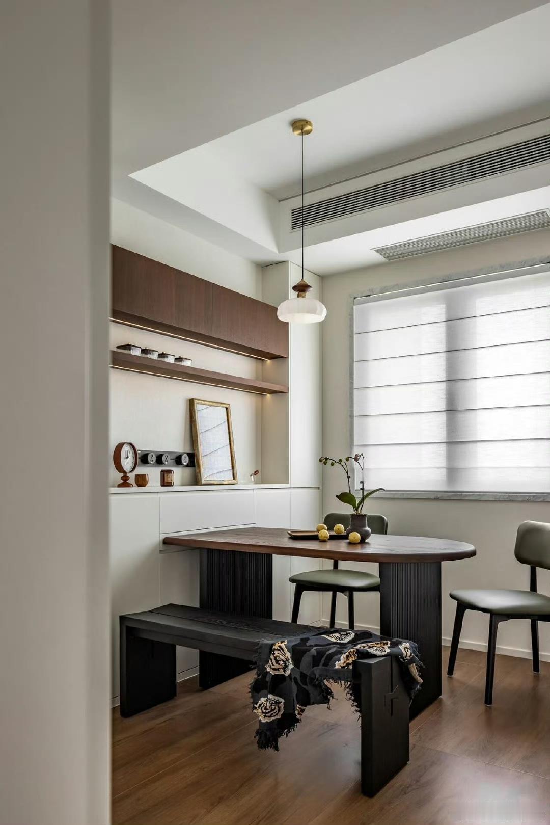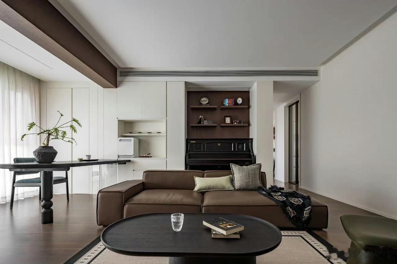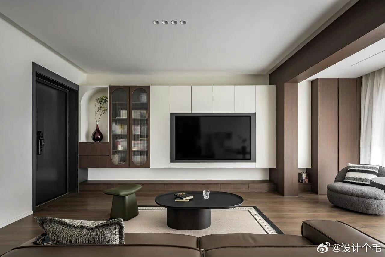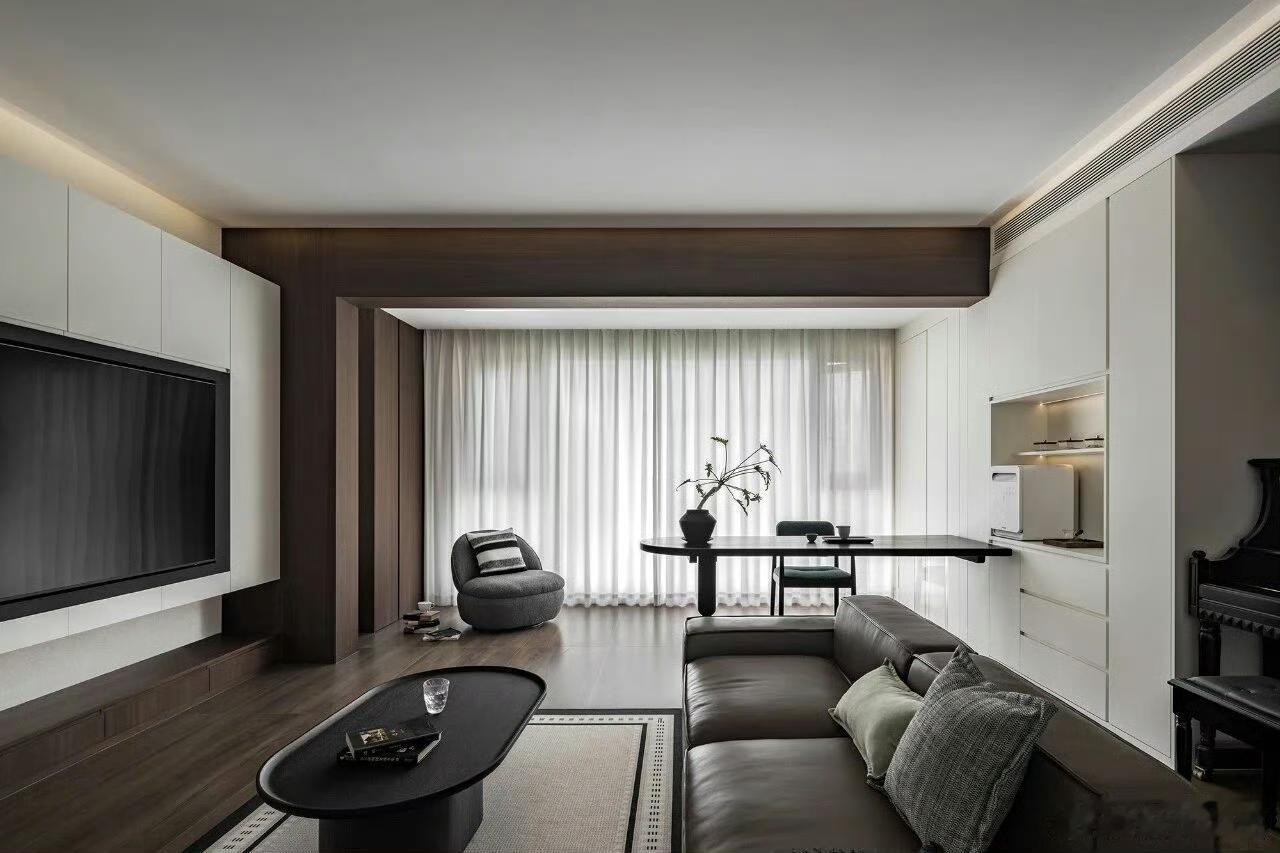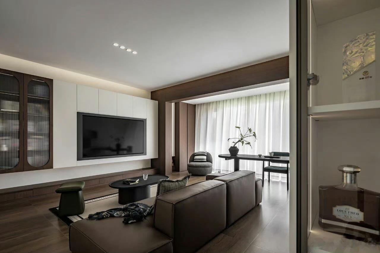 现代简约客厅真是时尚与舒适并存!就像湖北的这个装修案例,南北通透户型,入户门在中间,客厅和餐厅区域分明,两边窗户让通风采光超棒。 原本南面阳台并入客厅,做了整面落地窗,视野好还扩大了面积。顶面无主灯造型吊顶很有特色,一圈边吊顶和原始梁衔接,四周双眼皮造型,中间一层平顶。电视背景墙一侧装了黑色轨道,能安不同灯具。这种设计没有过多繁杂装饰,却处处透露着精致与温馨,尽显现代简约的时尚品味,让人看了就想效仿。