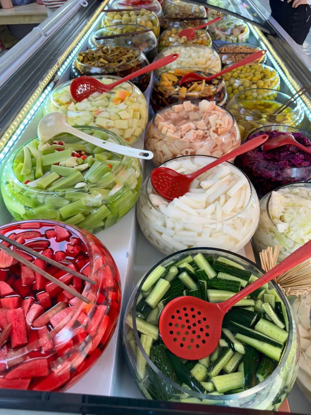 除了水果,酸嘢也会用到新鲜的蔬菜,但大多是萝卜、黄瓜、凉薯这种水分充足、口感脆嫩的根茎类,或者包菜、紫甘蓝这样口感脆爽的蔬菜。