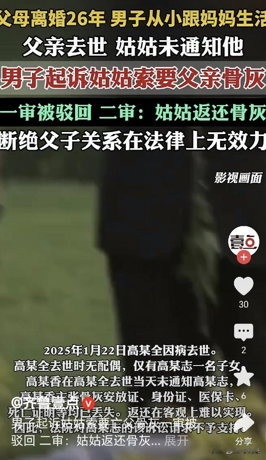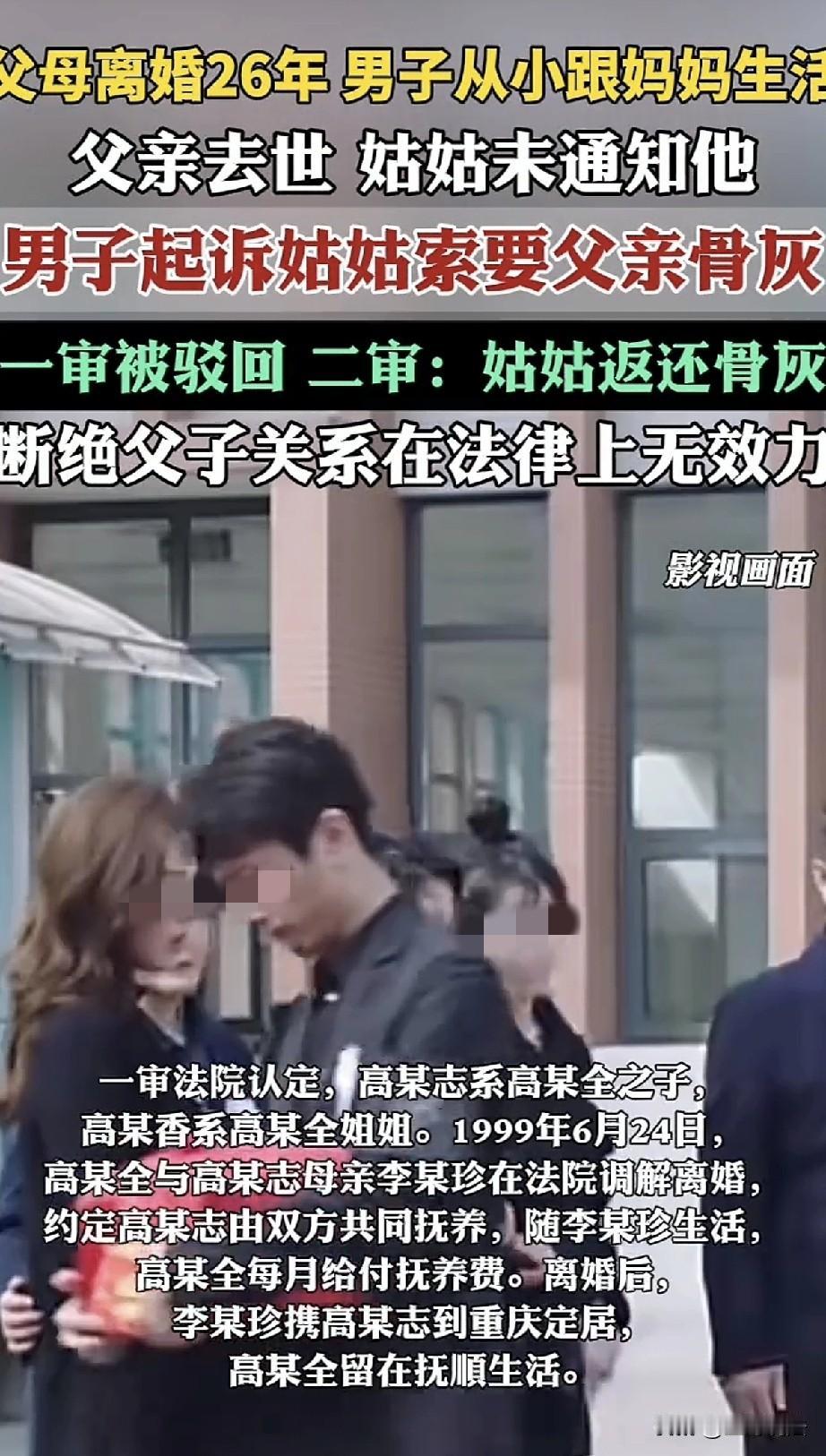 辽宁抚顺,一男子小的时候,父母离婚,男子跟随母亲生活,父亲支付抚养费,男子长大之后,从未和父亲联系,他偶然得知,父亲已经去世,他立刻赶回老家,发现是二姑办的后事,男子找到二姑,索要父亲的骨灰及证件和银行卡,二姑拒绝,说父亲的一切,和他没任何关系,男子告到法院,二姑拿出视频遗嘱,父亲生前表示,他和儿子断绝关系,死后不要墓地,不存骨灰,遗产归二姐所有,案件经过一审二审,结果令人意外! 高某志小的时候,父母总是吵闹,他心里害怕,吓得躲到一旁,大气不敢出来一声。 1999年,父亲高某全和母亲李某珍协议离婚,高志年纪还小,跟着母亲生活,由父亲高某全支付儿子的抚养费。 李某珍带着高某志,回到了重庆生活,父亲高某全依旧在老家辽宁抚顺。 从此以后,父子俩天各一方,再也没有联系,高某志懵懂无知,只知道一家三口,再也不能在一起生活。 高某志跟着母亲,渐渐长大成人,在这期间,父亲高某全,按时支付给他抚养费。 高某志毕业之后,参加了工作,没过几年,他又结婚生子,父亲在他心里,早已没了印象,在他心里,只有母亲的存在。 可是,他没有想到过,父亲也在远方关注着他,这些年来,高某全从未对抚养费有过拖欠。 高某全认为,虽然夫妻已经离婚,成为了陌路,可是儿子是自己的血脉,这是永远不变的事实。 可是儿子高某志,三四岁就离开了父亲,他的脑海里,已经完全记不起父亲的样子。 这些年来,各自忙碌着各自的事情,因为各种原因,父子自从离别之后,自始至终就再没见面。 2024年的时候,高某全病重,他卧床不起,千盼万盼希望能够见到儿子。 可是儿子高某志,从来没有主动联系过父亲,更不要说会来床前尽孝。 高某全孤苦一人,躺在病床,只有他的二姐高某香跑前跑后,给他看病,照料他的起居。 高某全等来等去,等不到儿子高某志的消息,他心寒意冷,彻底放下了这个儿子。 高某全自知时日无多,2025年1月12日,高全趁着自己尚且清醒,他录下两段视频。 其中一段,他在视频里说:我以后要是不在了,家里的一切,包括房车,都由二姐高某香继承。 他想了又想,又录下了另一段视频,他表情决绝: 儿子高某志已经和我断绝关系,我死之后,不留墓地。 我的骨灰海葬,如果不能海葬,就把骨灰撒到河里,这是我最后的心愿,希望能帮我实现。 之后不久,高某全溘然长辞,姐姐高某香哭的晕厥过去。 她按照弟弟的遗言,果然不再通知弟弟唯一的儿子,她给高某全办理了后事,将高某全的骨灰安放到一个她才知道的地方。 她又将各种证明存放在一起,包括弟弟的身份证,医保卡,死亡证明,以及骨灰安放证。 她不舍得把弟弟的骨灰撒到河里,那样她就彻底找不到弟弟去了哪里,就连祭奠,都没有地方。 高某志远在他方,对父亲的去世,他恍然无知,有人好事,把消息告诉了他,高某志惊呆,他赶忙匆匆往老家赶去。 等他回到老家,早就物是人非,他找到二姑,说他想要祭奠父亲,二姑表情冷漠,说高某全的骨灰没有安放地址。 高某志得知,父亲的后事都是二姑办理,那父亲的所有证件财产,一定是在二姑高某香手里。 二姑不理,后事已经办完,这些东西留着也没有用,早就丢的不见影子。 高某志不愿意,我才是他唯一的儿子,你只是我父亲的姐姐,你没权利拿走这一切东西。 二姑忍不住打量着他,你还知道你是高某全的儿子,他卧病在床,需要儿子孝敬,你在哪里?你有没有想到过你还有个父亲? 你父亲虽然没有陪伴着你,但你的抚养费他一分没少给你! 你成年以后你回来过没有?你还知不知道这里是你的老家,是你的根,有你的父亲,还有你的亲人? 高某志哑口无言,二姑冷笑一声,你这恐怕不是要骨灰来了,你只想要的是银行卡吧? 高某志要不到东西,一纸诉状告到法院,要求二姑归还父亲骨灰和各种证件及父亲的银行卡。 案件到了法院,可高某志无法证明这些证件,银行卡,以及高某全的骨灰都在高某香手里,如果想要,只能去补办。 因此一审判决,驳回了高某志的诉求。 高某志上诉,案件到了二审法院。 高某香拿出遗嘱视频,视频里高某全明确表示,和高某志断绝父子关系,所有遗产归二姐所有。 二审查明,高某全骨灰寄存在某公益公墓。 《民法典》第153条规定:违反法律、行政法规的强制规定的民事法律行为无效。 父子关系基于血缘产生,属于自然血亲关系,即便高某志成年后未主动联系父亲、未尽赡养义务,也仅影响遗产分配份额,并不能改变与高某全的父子关系。 《民法典》第994条规定:死者的姓名、肖像、名誉、荣誉、yin私、遗体等受到侵害的,其配偶、子女、父母有权依法请求行为人承担民事责任。 骨灰属于具有人格象征意义的特定物,高某志作为高某全的儿子,是第一顺位的权利主体,依法享有祭奠、保管骨灰的权利。 二审改判,高某香将高某全骨灰归还给高某志。 对此,你怎么看? 关注@王哥说法 多学法律少吃亏!