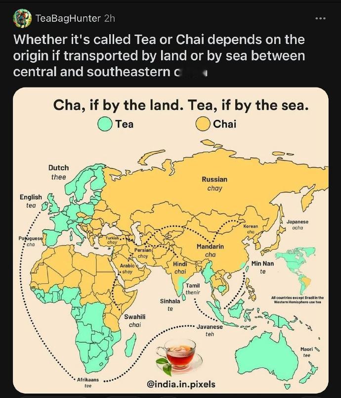 茶,Cha or Tea,Cha通过陆路传播,Tea源自闽南语tê,通过海路传播。