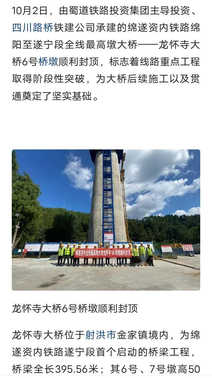 好消息,绵阳至遂宁时速250公里的绵遂铁路全线最高桥墩(约50米)龙怀寺大桥6号墩已经顺利封顶,梁帽山隧道和太和隧道等重点工程正在全速建设中,预计2028年可以实现从绵阳站坐动车50分钟左右直达遂宁站和遂宁高新站,绵遂铁路全长约136公里,全线设绵阳、绵阳南、三台、射洪、遂宁、遂宁高新共6坐车站,未来有望从绵阳南经安州区直接连接至时速200的川青铁路上,绵遂铁路是三台和射洪两个人口大县期盼多年的铁路梦,建成后将极大方便两地人民出行,三台和射洪未来坐动车直达重庆只需不到2小时,绵阳坐动车来往南充和达州等地也将更加便捷,绵遂铁路目前全线处于加速施工阶段,部分路段桥墩已经建成,三台和射洪车站也正在开始建设中。