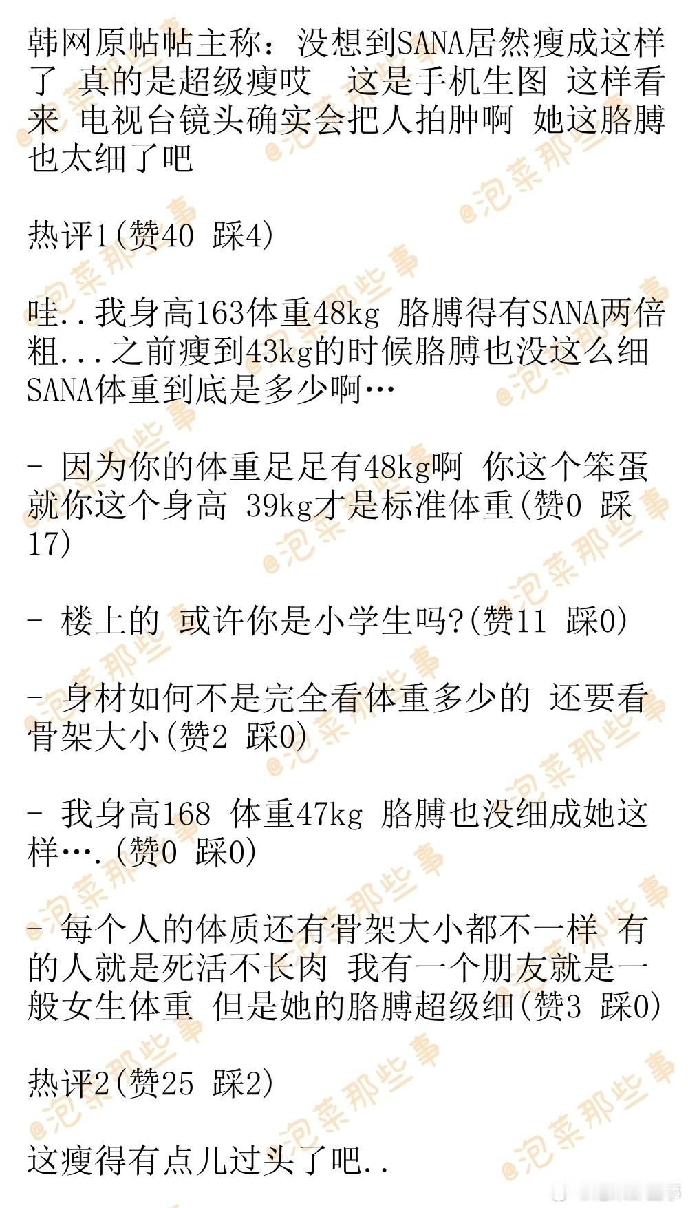 韩网原帖帖主称:没想到SANA居然瘦成这样了 真的是超级瘦哎 这是手机生图 这样看来 电视台镜头确实会把人拍肿啊 她这胳膊也太细了吧
