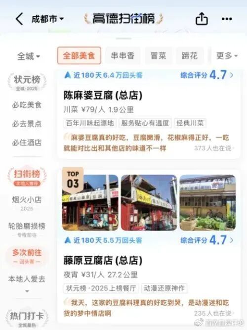 在成都,高德扫街榜曾将“藤原豆腐店”作为美食店推荐,位列成都美食前三。但事实上,这是一家致敬日本漫画《头文字D》的网红打卡点,并非真正意义上的餐馆。