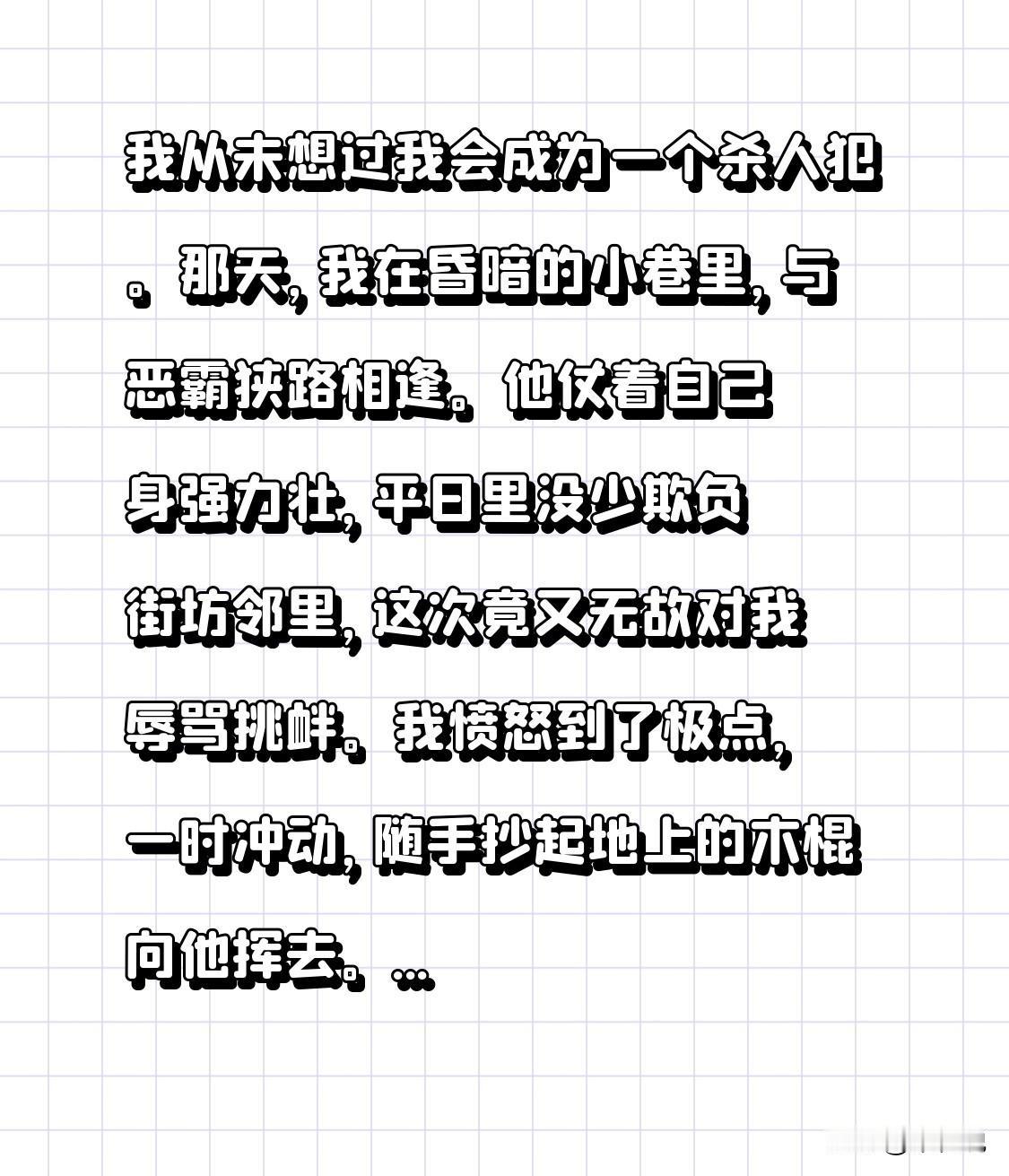 我从未想过自己会成为杀人犯。那天,在昏暗小巷我与恶霸迎面撞上。他身强力壮,平日没