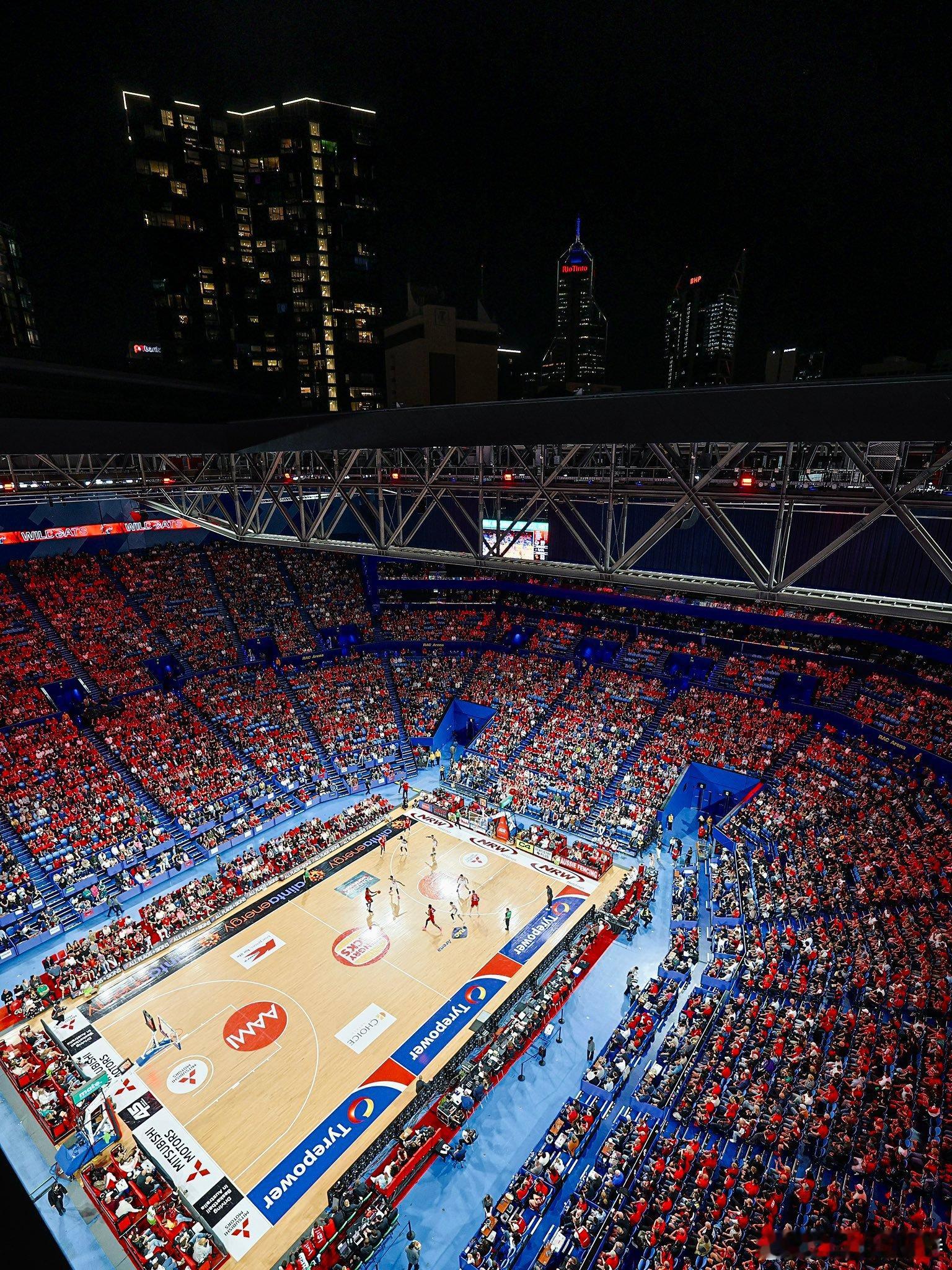 NBL珀斯野猫队的敞篷比赛现场照,室内与室外、赛场与城市融为一体,视觉效果相当壮观。